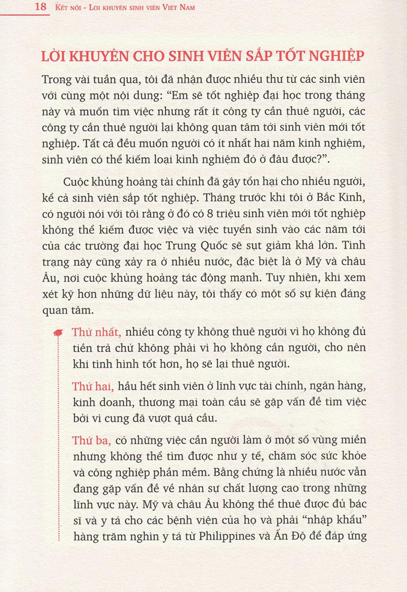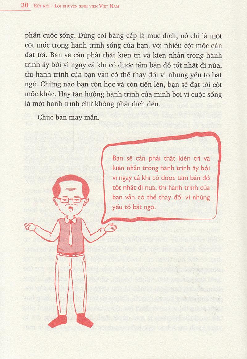 Những bài viết trong cuốn sách này rất phù hợp với các bạn trẻ Việt Nam, cung cấp cho các bạn những kiến thức cần thiết để vững bước trên hành trình gây dựng sự nghiệp cho riêng mình. Mong rằng các bạn tìm thấy ở đây câu trả lời cho những khó khăn đang gặp phải, cũng hy vọng các bạn tìm thấy tương lai của mình, góp phần cống hiến cho tương lai đất nước. Cuốn sách “Kết Nối” sẽ mang lại cho các bạn sự chuẩn bị đó. Nếu bạn là sinh viên sắp, hoặc mới tốt nghiệp, đang trên con đường tìm kiếm cho mình một công việc không chỉ để nuôi sống bản thân mà còn nuôi dưỡng những khát khao, hãy đi theo hành trình của cuốn sách này.