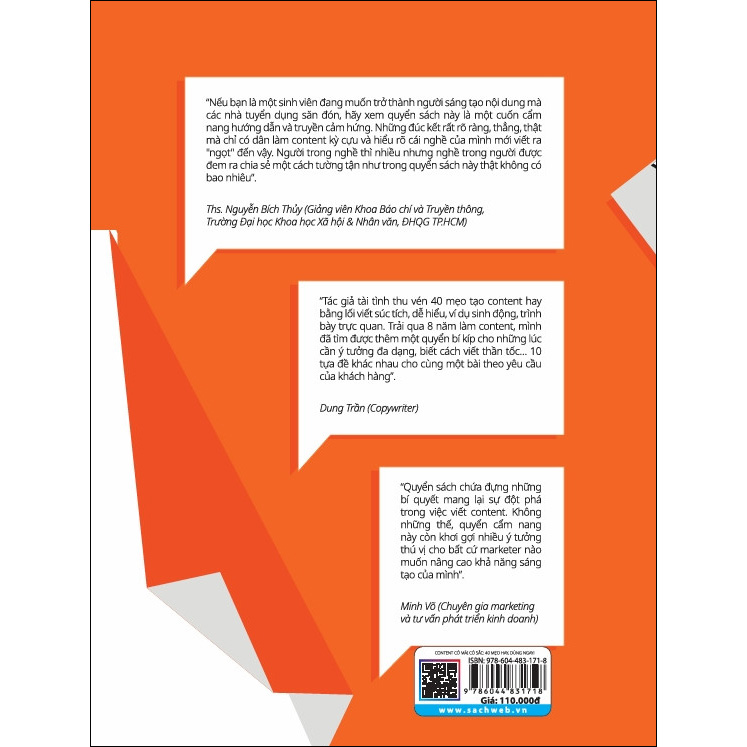 Những phương pháp gợi ý trong sách được đúc kết từ kiến thức chuyên môn và kinh nghiệm thực tiễn hoạt động nghề nghiệp của cá nhân tác giả, có thể không phải là công thức duy nhất đúng trong tất cả các trường hợp nhưng chắc chắn là những giải pháp, gợi mở có giá trị và đáng để tham khảo trong quá trình lên kế hoạch và triển khai content.