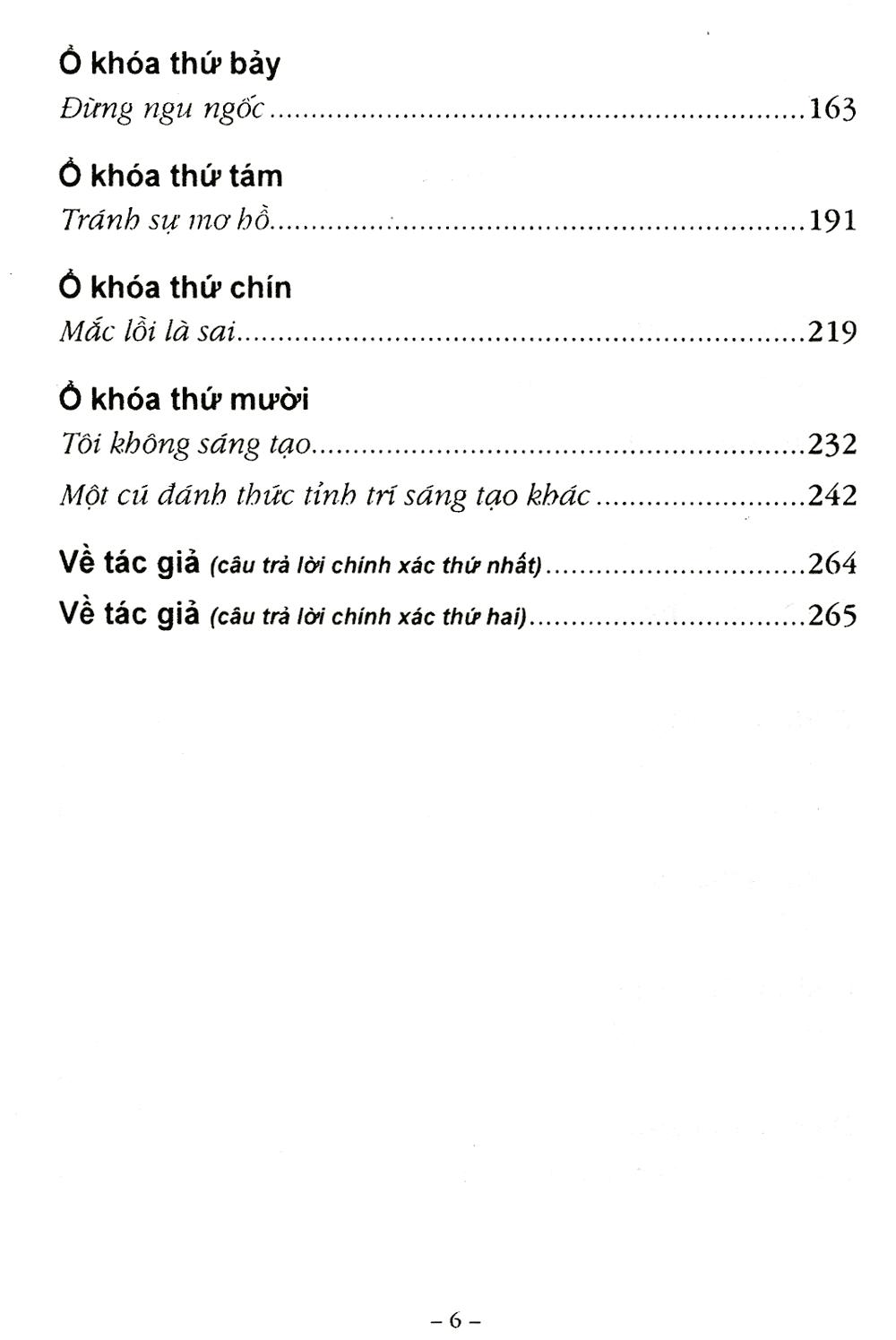 Tất cả chúng ta, ai cũng làm việc cần cù và rất muốn có được những ý tưởng sáng tạo. Đôi khi chúng ta tự hỏi, vì sao m.ình không có được những thành công rực rỡ như Leonardo da Vinci, Thomas Edison, Albert Einstein… Không phải chúng ta quá kém cỏi, mà thực tế, có 10 “ổ khóa trí tuệ” thường dẫn dắt, giam hãm chúng ta theo những lối mòn, trong những khuôn mẫu. Vì thế, nhiều khi cần có những “cú đánh” để thức tỉnh sự sáng tạo trong mỗi con người. Đó là thông điệp quý báu mà tác giả cuốn sách này, Tiến sĩ Roger von Oech, muốn gửi đến chúng ta.
