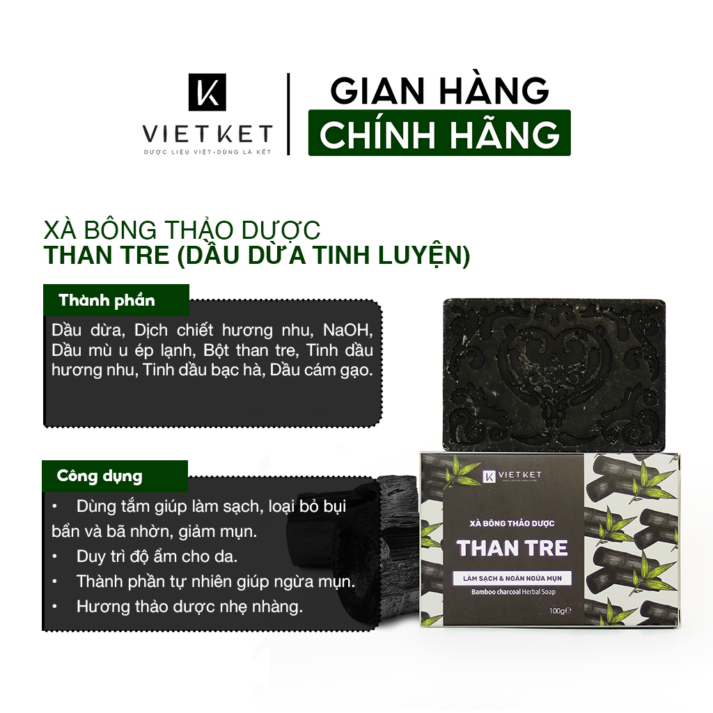 Xà bông thảo dược Than Tre (Dầu dừa tinh luyện) VIETKET là sự kết hợp tinh túy của các loại tinh dầu, thảo dược có thành phần tự nhiên dưới bàn tay của VIETKET