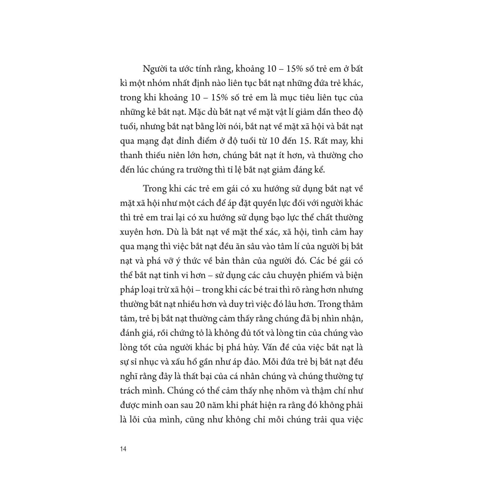 Cuốn sách Cùng Con Chống Nạn Bắt Nạn - Các công cụ thiết thực để bảo vệ và xây dựng sự mạnh mẽ cho con bạn. Cuốn sách khám phá thế giới đen tối của nạn bắt nạt, tất cả các lí do tại sao mọi người lại đi bắt nạt, tại sao một số cá tính lại cố gắng áp đạt quyền lực với bạn bè, tại sao một số người thường trở thành mục tiêu nhiều hơn những người khác và tại sao những người ngoài cuộc không can thiệp. Từ đó, tác giả đưa ra những phương pháp tiếp cận khác nhau để cha mẹ bảo vệ con, giúp con phục hồi sau trải nghiệm bị bắt nạt, đồng thời xây dựng sự tự tin, kiên cường và mạnh mẽ ở con.