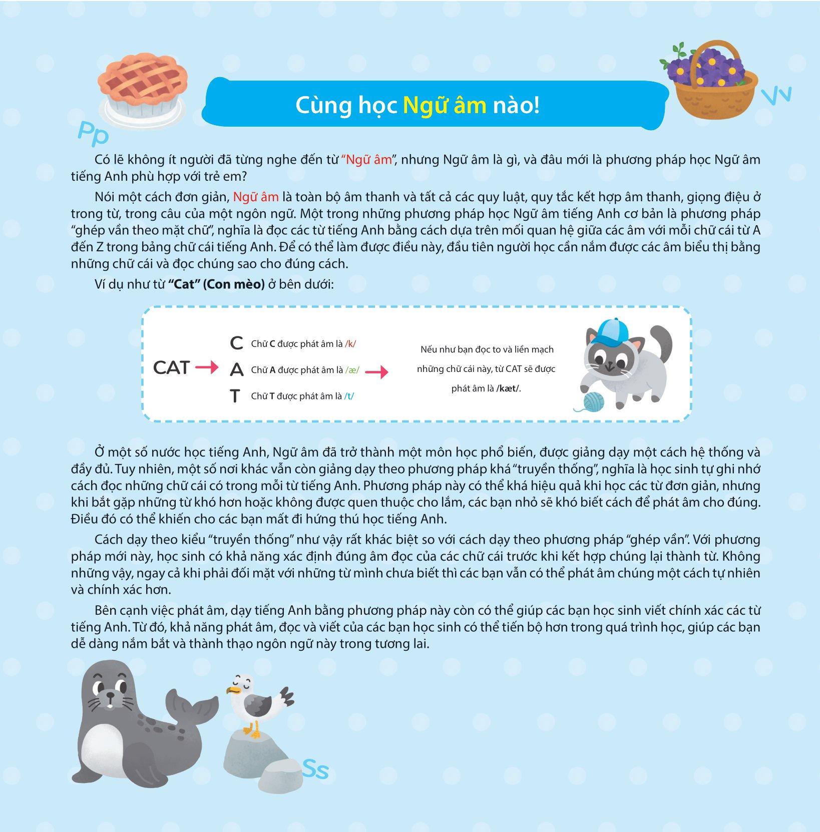 Ngữ âm là một phần rất quan trọng trong việc học ngoại ngữ nói chung và việc học tiếng Anh nói riêng, bởi vì nó chính là nền tảng để các em có thể nghe hiểu tốt, phát âm chính xác và viết đúng chính tả, từ đó giúp các em dễ dàng học các từ mới hơn và tạo tiền đề để các em phát triển đồng đều cả bốn kỹ năng nghe, nói, đọc, viết. Với những ví dụ sinh động, dễ tiếp thu, kèm theo các bài thực hành nâng cao đầy tính thực tiễn và các audio dạy phát âm chuẩn bằng giọng Anh-Mỹ bản xứ, bộ sách sẽ cung cấp cho các em những kiến thức cần thiết để học ngữ âm tiếng Anh. Đúng như tên gọi, bộ sách được chia thành ba cấp độ từ cơ bản đến phức tạp, hướng dẫn các em rèn luyện từng bước một để nắm chắc các âm trong tiếng Anh. Ngoài ra, bộ sách còn lồng ghép những bài hát vui nhộn và những câu chuyện ngắn được minh họa đẹp mắt, hứa hẹn sẽ giúp cho việc học tập của các em thêm phần thú vị và hiệu quả. Bộ sách gồm các chủ đề