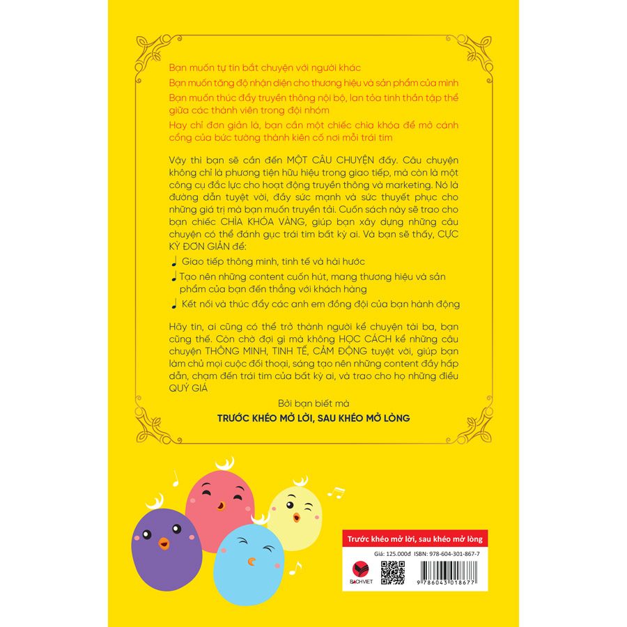 Trước khéo mở lời, sau khéo mở lòng Bí kíp kể chuyện chinh phục mọi trái tim Tác giả: Hàn Tiếu Bạn muốn tự tin bắt chuyện với người khác Bạn muốn tăng độ nhận diện cho thương hiệu và sản phẩm của mình Bạn muốn thúc đẩy truyền thông nội bộ, lan tỏa tinh thần tập thể giữa các thành viên trong đội nhóm Hay chỉ đơn giản là, bạn cần một chiếc chìa khóa để mở cánh cổng của bức tường thành kiên cố nơi mỗi trái tim Vậy thì bạn sẽ cần đến MỘT CÂU CHUYỆN đấy. Câu chuyện không chỉ là phương tiện hữu hiệu trong giao tiếp, mà còn là một công cụ đắc lực cho hoạt động truyền thông và marketing. Nó là đường dẫn tuyệt vời, đầy sức mạnh và sức thuyết phục cho những giá trị mà bạn muốn truyền tải. Cuốn sách này sẽ trao cho bạn chiếc CHÌA KHÓA VÀNG, giúp bạn xây dựng những câu chuyện có thể đánh gục trái tim bất kỳ ai. Và bạn sẽ thấy, CỰC KÌ ĐƠN GIẢN để: > Giao tiếp thông minh, tinh tế và hài hước > Tạo nên những content cuốn hút, mang thương hiệu và sản phẩm của bạn đến thẳng với khách hàng > Kết nối và thúc đẩy tất các anh em đồng đội của bạn hành động Hãy tin, ai cũng có thể trở thành người kể chuyện tài ba, bạn cũng thế. Còn chờ đợi gì mà không HỌC CÁCH kể những câu chuyện THÔNG MINH, TINH TẾ, CẢM ĐỘNG tuyệt vời, giúp bạn làm chủ mọi cuộc đối thoại, sáng tạo nên những content đầy hấp dẫn, chạm đến trái tim của bất kì ai, và trao cho họ những điều QUÝ GIÁ Bởi bạn biết mà Trước khéo mở lời, sau khéo mở lòng Cuốn sách mang lại cho bạn điều gì Nhiều người cho rằng kể chuyện hay có vẻ là một kỹ năng chẳng mấy hữu dụng, nhưng thực tế hoàn toàn ngược lại. Biết cách kể một câu chuyện hay có thể giúp chúng ta đơn giản hóa rất nhiều vấn đề khó khăn và dễ dàng hóa giải những tình huống bối rối. Mỗi khi rơi vào tình cảnh khó xử, không có giải pháp nào tốt hơn là kể một câu chuyện hài hước. Ngoài ra, cuộc sống của chúng ta được dệt nên từ vô vàn câu chuyện, thông qua các câu chuyện đó, mọi người có thể dần dần giảm bớt những cảm xúc lo lắng, tìm ra cách giải quyết vấn đề và học hỏi những kỹ năng để cải thiện bản thân. Câu chuyện không chỉ là một cách giao tiếp hiệu quả, mà còn là một kỹ năng để nâng cao chất lượng cuộc sống Rất nhiều người đã phát hiện ra sức hút độc đáo của các câu chuyện. Nghệ thuật kể chuyện cũng dần trở thành một kỹ năng quan trọng, do đó những người biết cách kể chuyện sẽ có thể gặt hái nhiều thành công hơn Bất kỳ ai cũng có thể học cách kể chuyện và sáng tạo content của riêng mình. Đừng lo rằng mình không khéo ăn khéo nói hay không đủ nhanh nhạy, thông minh. Chúng ta luôn có sẵn những lời muốn cất lên, những thông điệp muốn tỏa phát, những giá trị muốn truyền đi. Điều còn lại là bạn cần học cách biến chúng thành một nội dung cuốn hút Bằng những ví dụ dễ hiểu và những câu chuyện “người thật việc thật”, Trước khéo mở lời, sau khéo mở lòng sẽ hướng dẫn độc giả cách chuẩn bị nội dung cho câu chuyện, các phương pháp kể chuyện cần thiết, các phương tiện để truyền tải câu chuyện và cách ứng dụng câu chuyện trong các hoàn cảnh khác nhau  Nắm vững những bí quyết trong cuốn sách này, bạn có thể tự tin kết nối, thu hút trái tim mọi người và lan tỏa những giá trị tích cực đến bất kỳ ai