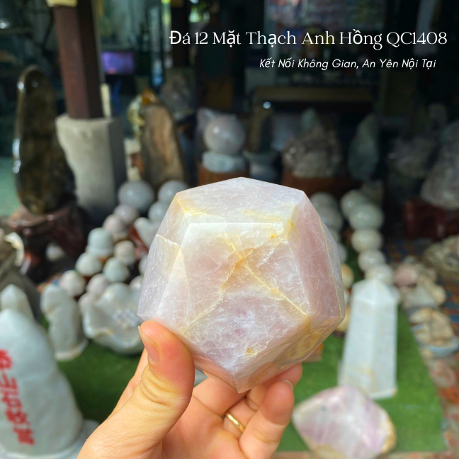 - Trưng bày viên đá ở những nơi bạn cảm thấy cần sự bình yên và năng lượng yêu thương. Đừng bỏ lỡ cơ hội sở hữu đá 12 mặt thạch anh hồng QC1408, người bạn đồng hành tuyệt vời trên hành trình tìm kiếm sự an yên và cân bằng trong tâm hồn!