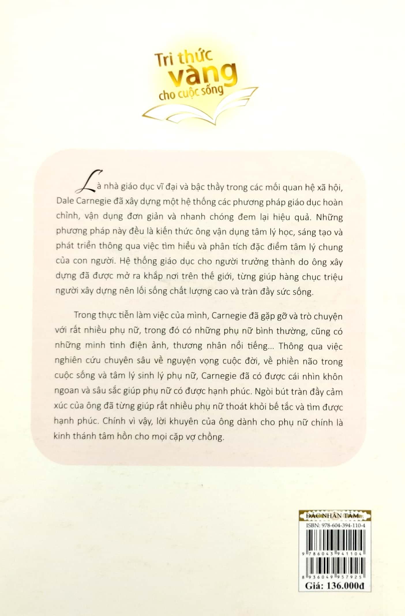Dale Carnegie đã phân tích lý luận sâu sắc và đưa ra rất nhiều hành động cụ thể làm quy tắc và hướng dẫn. Tư tưởng và sự hiểu biết của ông rất sâu sắc, đồng thời cũng rất thực tế, dành cho tất cả phụ nữ, kể cả phụ nữ chưa kết hôn lẫn phụ nữ đã lập gia đình. Bất kể là ai, chỉ cần vận dụng thông minh và linh hoạt các phương pháp này, cô ấy có thể vượt qua mọi trở ngại trên con đường tìm kiếm hạnh phúc để có được một cuộc đời hạnh phúc, vui vẻ, như ý.