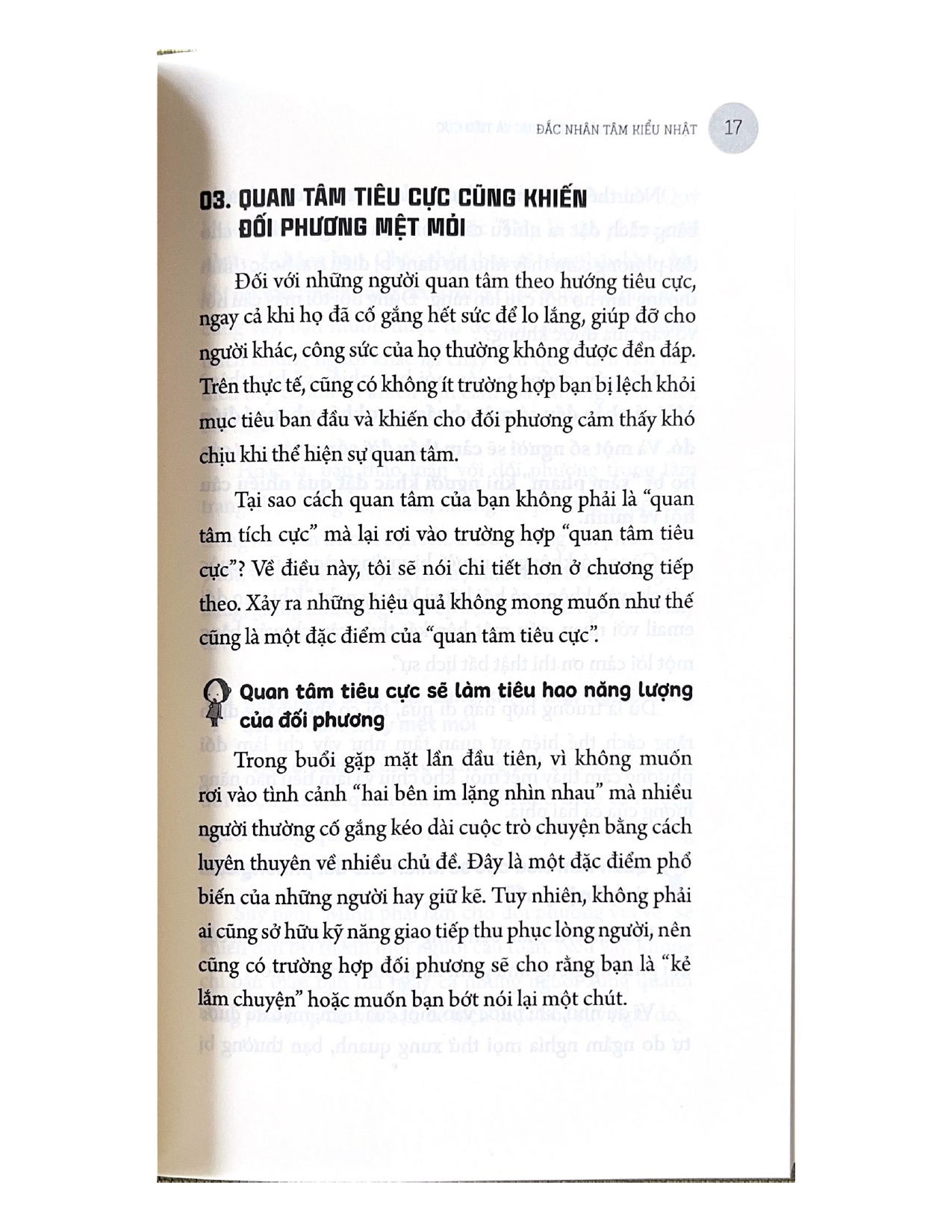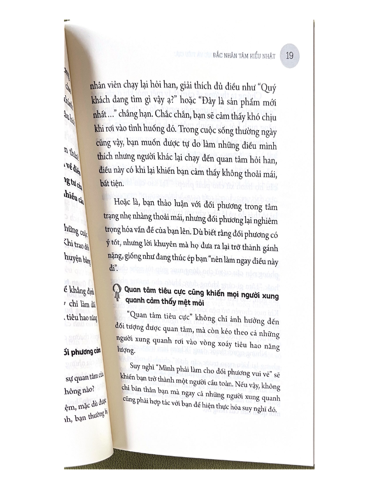 Thông qua những tình huống cụ thể và hình ảnh minh họa sinh động, ĐẮC NHÂN TÂM KIỂU NHẬT sẽ giúp bạn hiểu rõ hơn về khái niệm “quan tâm”, biết cách ứng xử và giao tiếp tích cực để xây dựng cuộc sống thoải mái, trọn vẹn hơn.