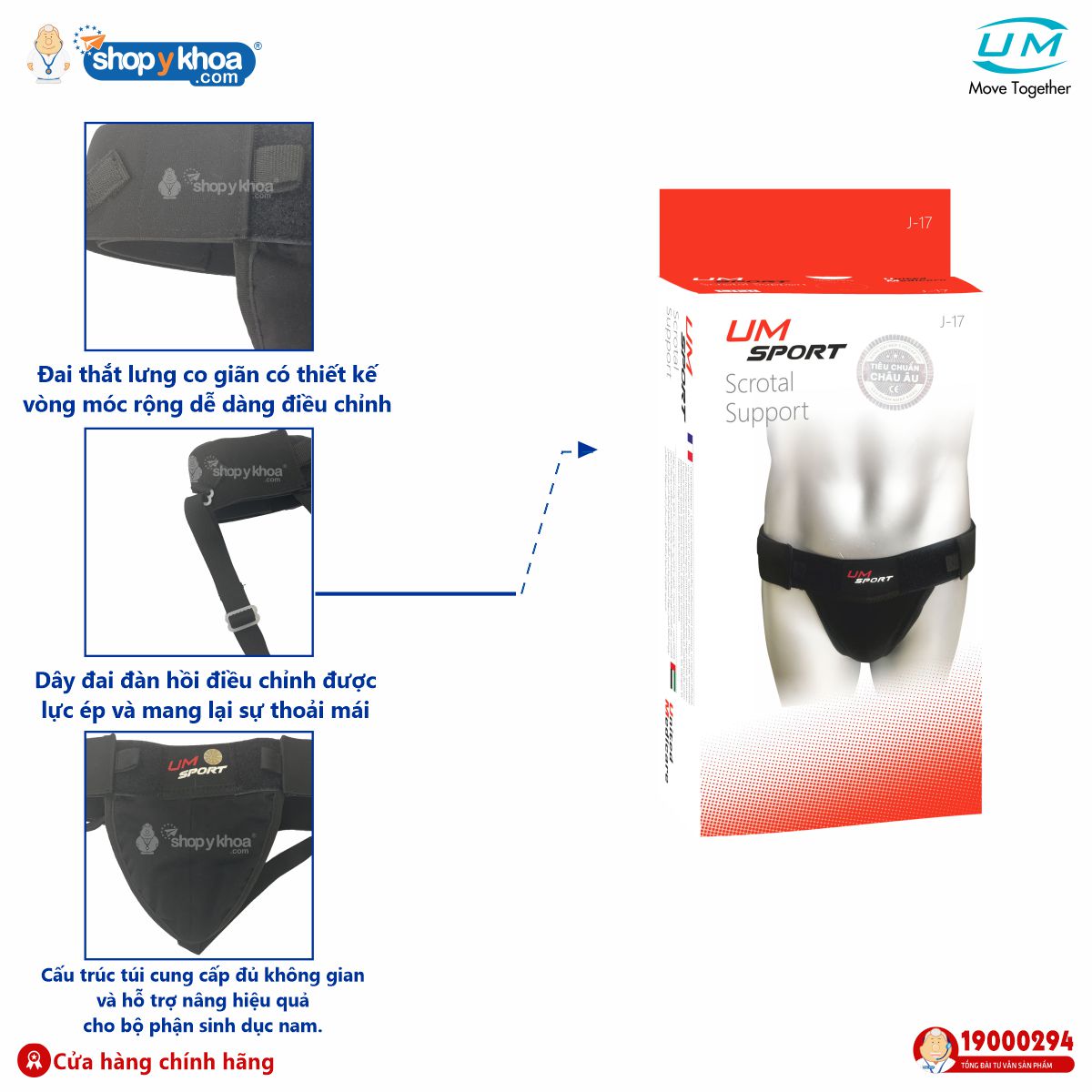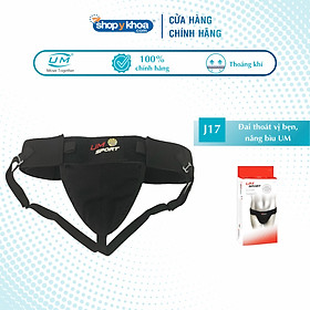 CHỈ ĐỊNH Đai thoát vị bẹn, nâng bìu UM (J17) có kiểu dáng rộng rãi, thoải mái, cung cấp đủ không gian, hỗ trợ hiệu quả cho thoát vị bẹn kèm túi nâng bìu riêng biệt. ĐẶC TÍNH VÀ HỖ TRỢ