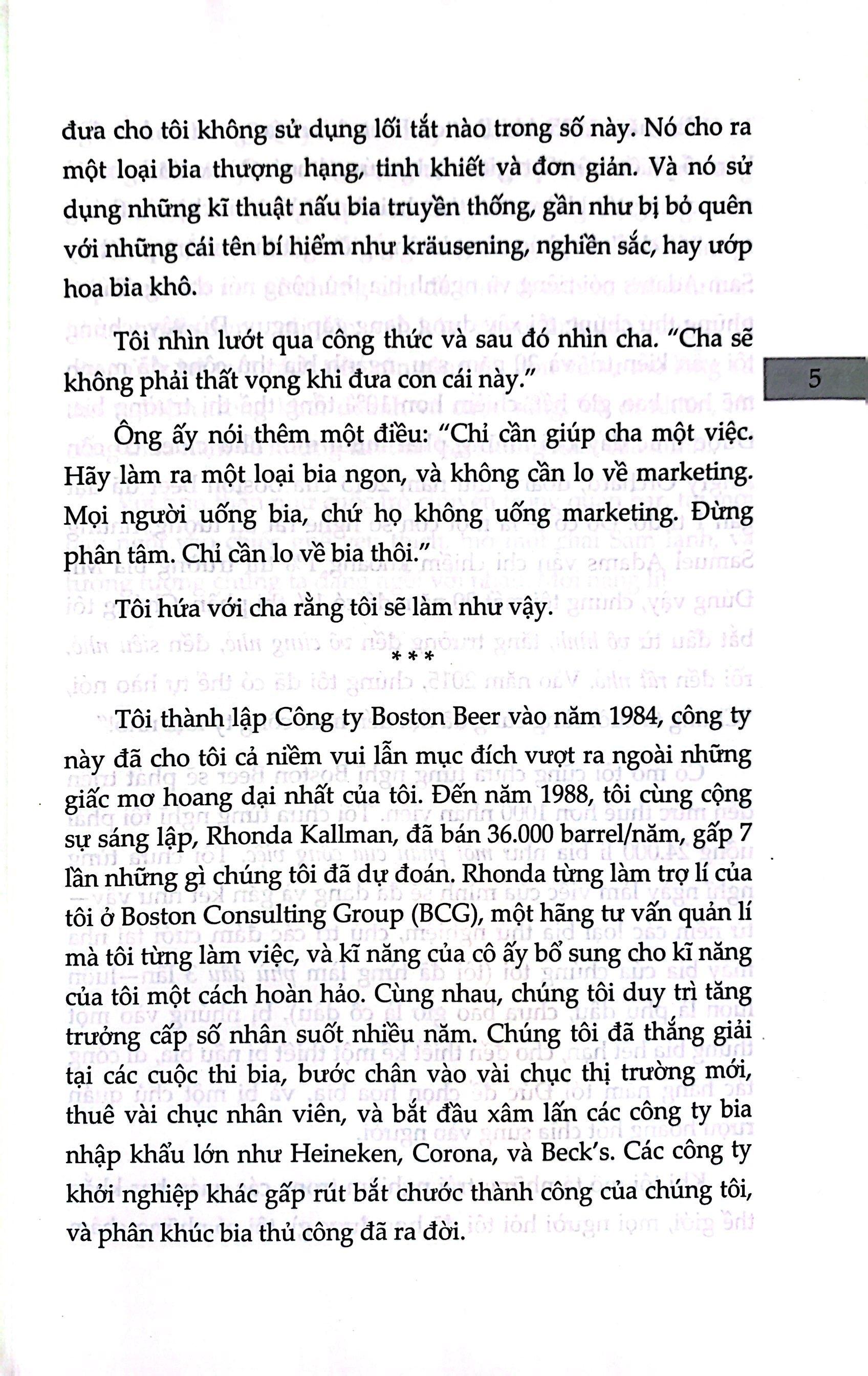 Khi đang là một chuyên viên tư vấn tại Boston Consulting Group nổi tiếng, Jim Koch đã có một quyết định mạnh mẽ: Ông nghỉ việc và mở một công ty bia. Vào thời điểm đó, ngành bia ở Mĩ khá ảm đạm; 3 công ty lớn sản xuất bia đại trà nhạt nhẽo thống trị, nhưng Jim tin tưởng rằng một loại bia đậm đà hương vị sẽ có thị trường của riêng mình.