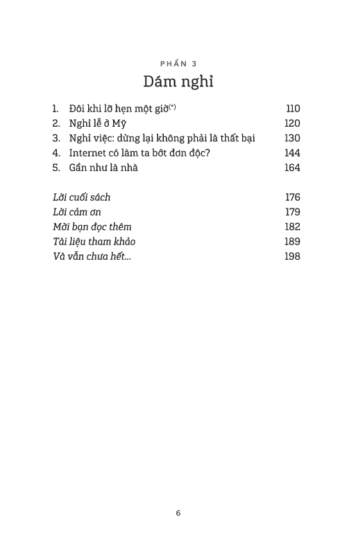 … Các mẩu chuyện nhỏ trong cuốn sách này có màu sắc chung là câu chuyện về những lựa chọn. Truyền thống hay phi truyền thống, mới hay cũ, tốt hay xấu, đúng hay sai là những đánh giá không có tính tuyệt đối. Chúng tùy thuộc vào hệ quy chiếu lăng kính, đối tượng, thời gian mà bạn chọn. Dám Nghi – Dám Nghĩ – Dám Nghỉ khuyến khích bạn gieo một sự hoài nghi vừa vặn để thôi thúc bạn đi tìm câu trả lời với một cái đầu mở, một trái tim nhạy cảm hồn nhiên để biết nghĩ cho bản thân cũng như cho người khác, và một sự dũng cảm để bỏ đi giá trị không còn đúng người đúng chỗ. Khi nói đến “Dám”, tôi cổ vũ sự thử nghiệm chừng mực và đề cao việc cân nhắc an toàn. Nói cách khác, tôi khuyến khích sự thử nghiệm liều lĩnh bứt phá theo tinh thần của các môn thể thao mạo hiểm: bạn nên trang bị thiết bị bảo hộ cần thiết, hỏi ý kiến chuyên gia và người có hiểu biết về pháp luật trước khi bắt đầu. Bạn cũng nên dự trù phương án xử lý sự cố. Dám nghi, dám nghĩ, dám nghỉ, hay dám hành động gì đi nữa chung quy cũng chỉ là để làm cho quỹ thời gian hữu hạn mỗi ngày trong cuộc đời này trở nên ý nghĩa nhất vì thời gian là nguồn tài nguyên quý giá nhất và không thể tái tạo lại của mỗi người. Tôi cảm ơn bạn vì đã dành thời gian cho quyển sách này.”