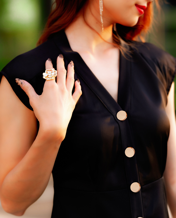 Cài bằng hàng nút đen bọc vàng ánh kim nổi bật phía trước