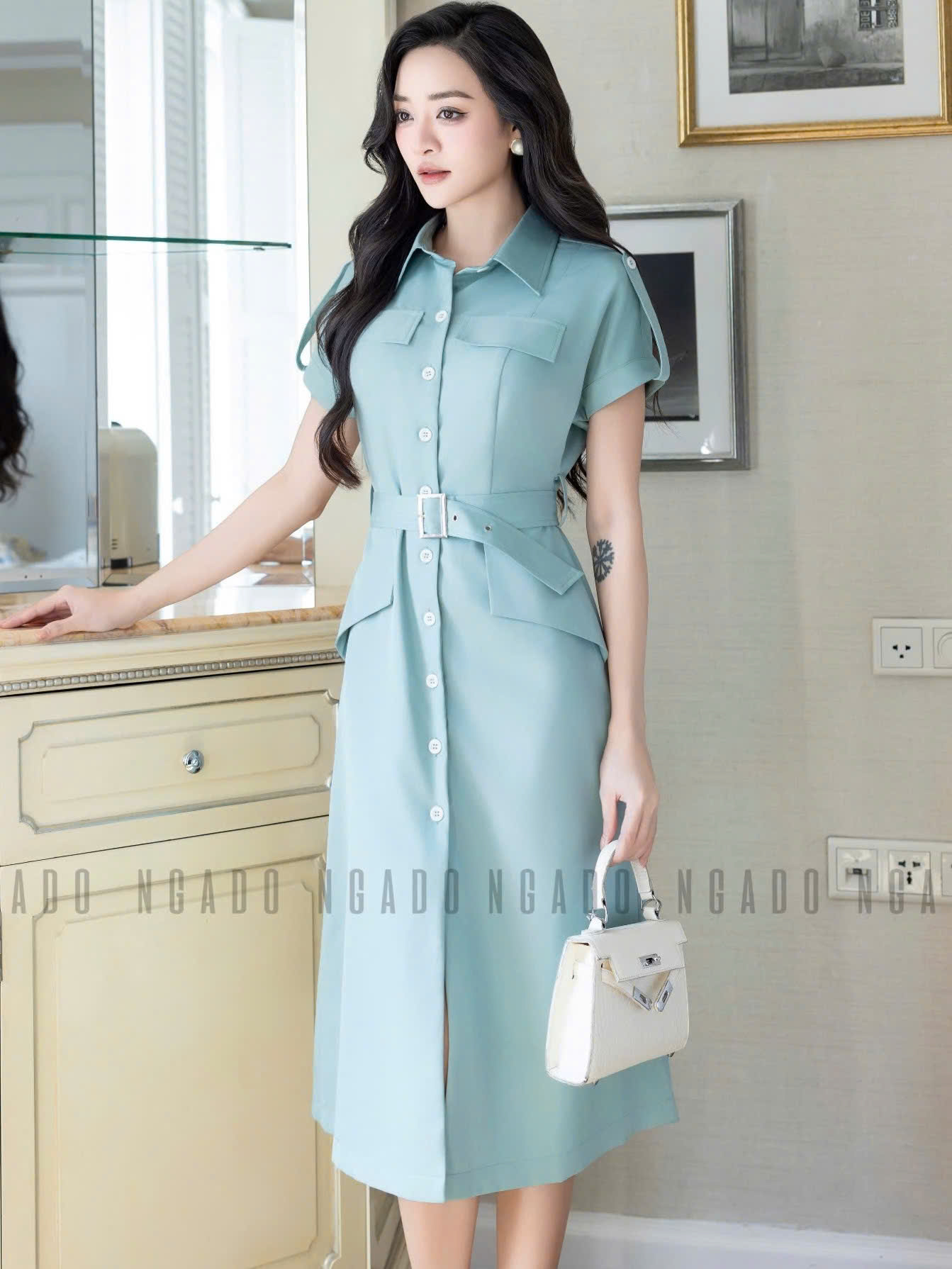 ✨Đầm sơ mi xanh mint NGADO , đầm công sở , đầm dự tiệc