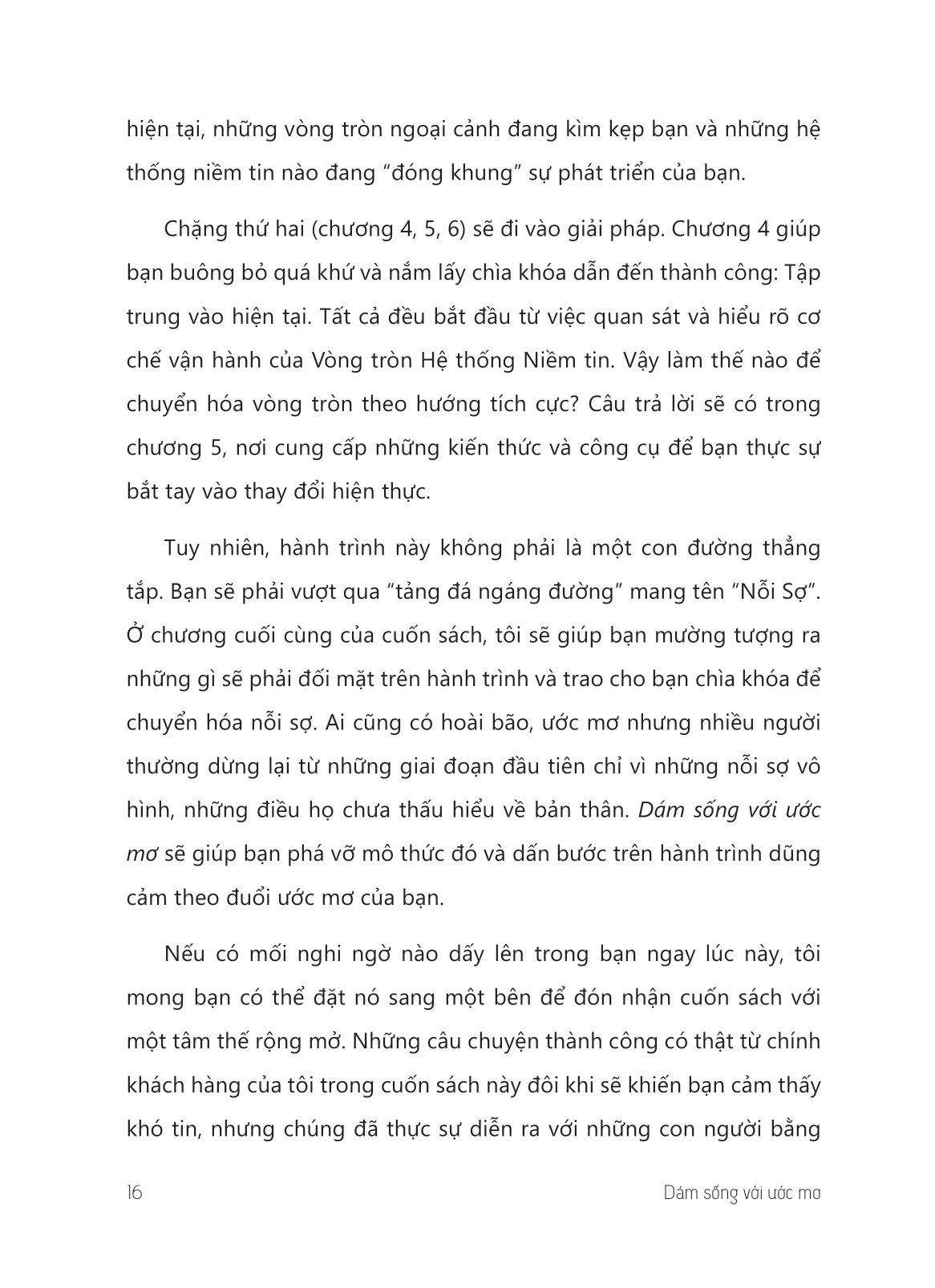 Dám Sống Với Ước Mơ Khi bạn cầm cuốn sách này trên tay thì đó là dấu hiệu đã đến lúc bạn cần nghiêm túc xem xét lại về những gì m.ình luôn thầm ao ước: sự tự do, sự nghiệp, tiền bạc, tình yêu, thời gian, hạnh phúc gia đình hay bất cứ khía cạnh nào khác. Dám sống với ước mơ không phải là một cuốn sách truyền động lực đơn thuần mà là một cuốn sách “hướng dẫn sử dụng cuộc đời”song hành dài hạn cùng bạn. Những công cụ trong sách đều đơn giản và tinh gọn, để ngay cả những người phụ nữ đã có gia đình với nhiều mối bận tâm vẫn có thể thực hành chạm tới những ước mơ đầu tiên và cả những ước mơ lớn hơn sau đó – thậm chí là những ước mơ bạn chưa từng tưởng tượng ra!