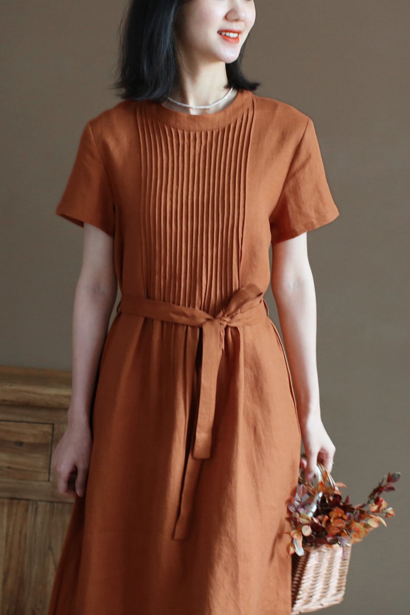 ✨Đầm suông linen nữ cổ tròn kín đáo, đầm có túi chéo tiện lợi, kèm dây thắt eo xinh NH191 cam
