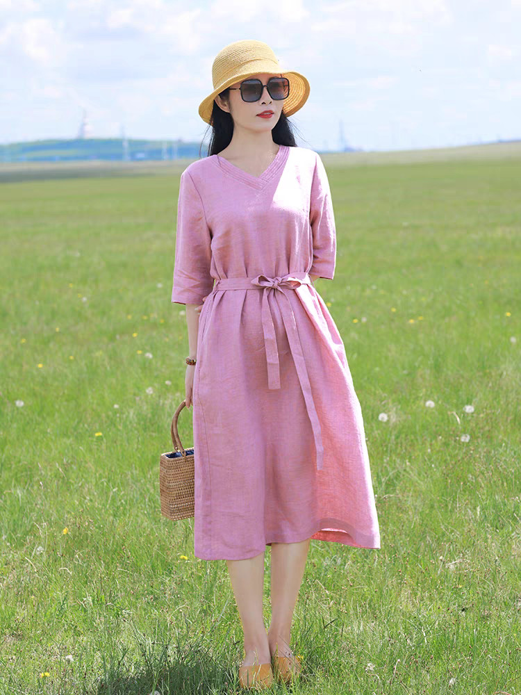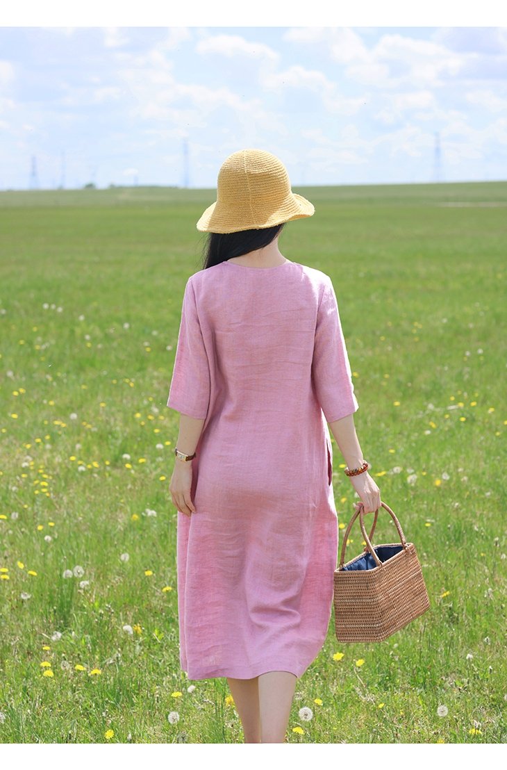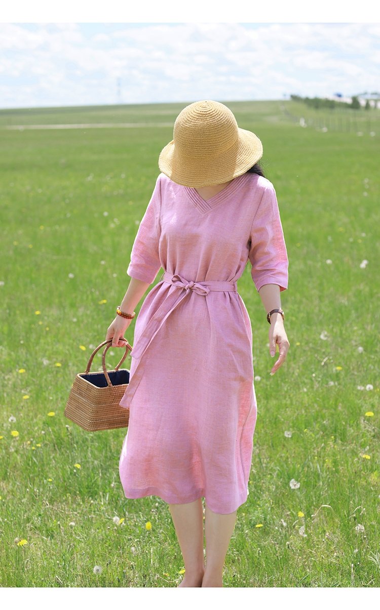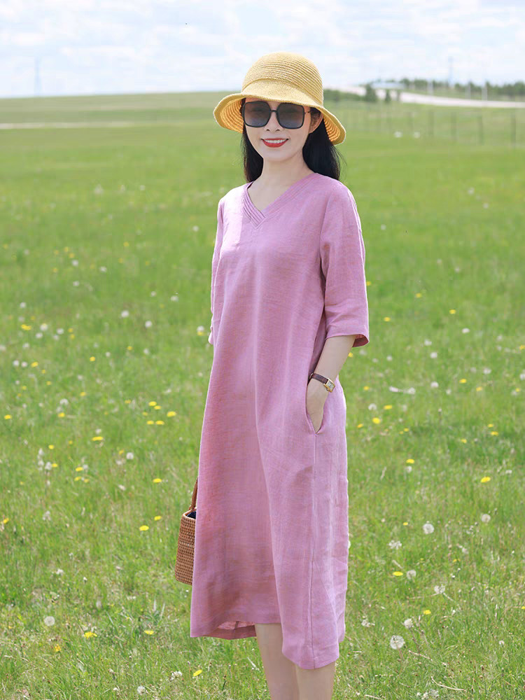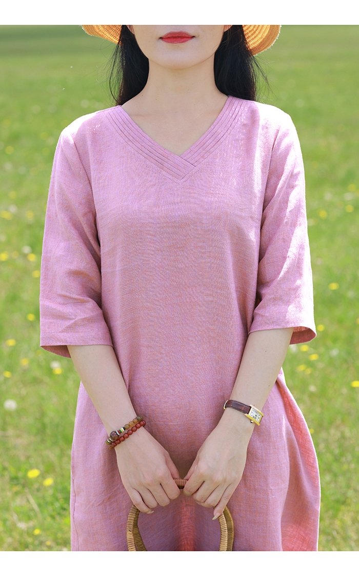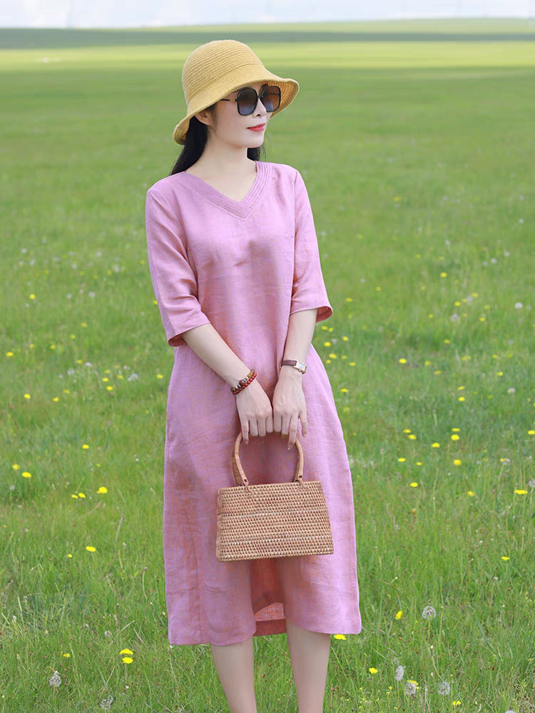 ✨Đầm suông linen nữ cổ V, thiết kế trơn basic, thời trang nữ thanh lịch, nhẹ nhàng NH198 hồng