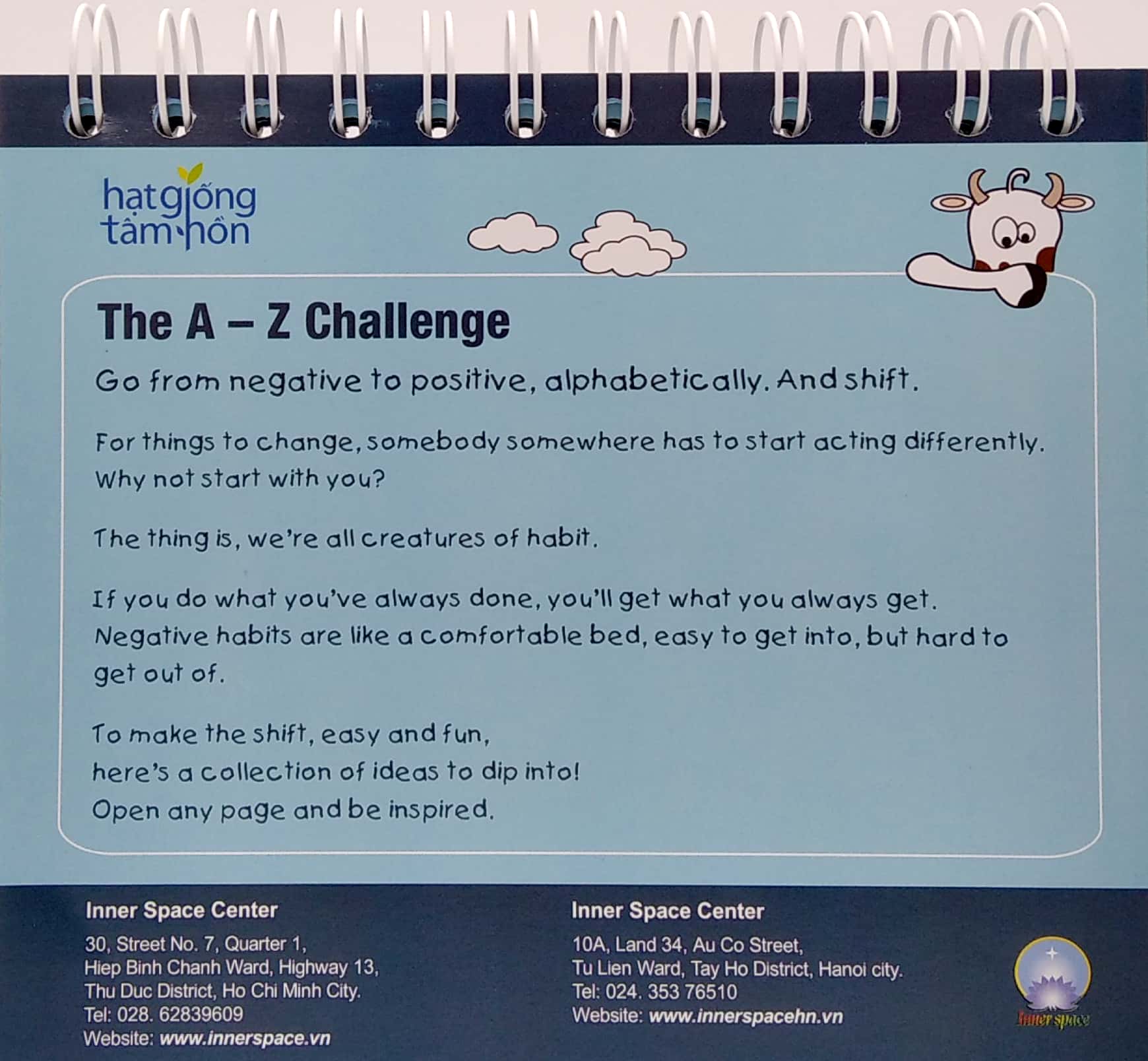 Dám Thay Đổi (được First News mua bản quyền và biên dịch từ The A to Z Challenge của tập đoàn BK Publications, Anh Quốc. Đây là cuốn sách có ý nghĩa sâu sắc về tinh thần, đặc biệt là cho những người đang ở trong tâm trạng và hoàn cảnh không thuận lợi, nhàm chán; mong muốn được thay đổi thái độ và nội tâm để có một tinh thần lạc quan, tích cực hơn. Trong cuốn sách này, ngoài việc chỉ ra những tâm trạng tiêu cực mà mọi người vẫn luôn phải đối diện trong cuộc sống, hai tác giả Inner Space và Covent Garden còn cung cấp cho bạn đọc tác hại mà những tâm trạng tiêu cực đó mang lại. Thêm vào đó, Inner Space và Covent Garden cũng giúp bạn đọc những cách thức để chuyến hóa những thái độ tiêu cực thành tích cực. Chẳng hạn với thái độ phàn nàn, hai tác giả chỉ ra: “Phàn nàn phá hỏng tâm trạng và triệt tiêu động lực của ta, cũng như của những người khác”. Để quên đi thái độ phàn nàn, hai tác giả đưa ra lời khuyên: “Luôn có điều gì đó để ta trân trọng và biết ơn, chẳng hạn như một mái nhà che mưa che nắng hay một buổi bình minh tuyệt đẹp”. Những trích dẫn đặc sắc trong cuốn sách: “Sự nhàm chán chỉ tạm thời nguôi ngoai trong khi ta mải mê với những trò tiêu khiển, nhưng ngay khi dừng cuộc chơi, ta lại rơi vào cảm giác chán chường”. “Nỗi sợ cũng giống như một thỏi nam châm. Nếu cứ tập trung vào nỗi sợ mơ hồ nào đó, dù không chủ ý thì bạn cũng sẽ hành động với nỗi sợ hãi, từ đó làm cho nó trở nên sống động y như thật”. “Những tổn thương quá khứ cứ mãi dai dẳng bởi vì ta liên tục hồi tưởng về chúng. Chính BẠN mới là người làm cho mình bị tổn thương”. “Ghen tị thường xuất phát từ việc hạ thấp bản thân và so sánh”.
