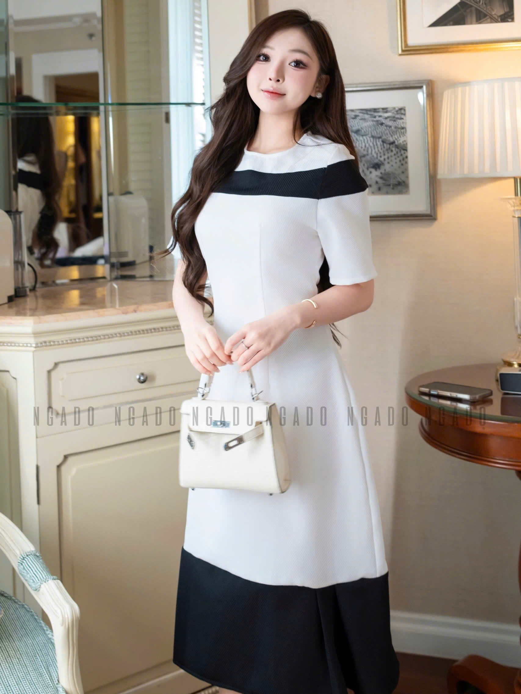 ღ THÔNG TIN SẢN PHẨM: Tên sản phẩm: Đầm trắng cổ tròn phối đen Màu sắc: trắng phối đen Chất liệu: chất bố Chi tiết sản phẩm: không lót, không túi.