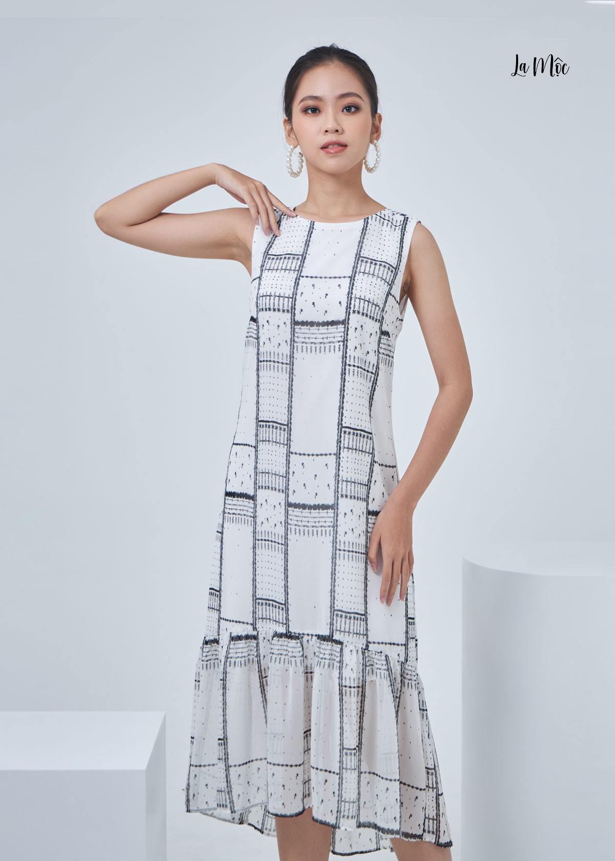 Mua tại TiktokĐầm voan La Mộc dáng suông, họa tiết mini kẻ khung, tay sát nách, chân váy nhún bèo.