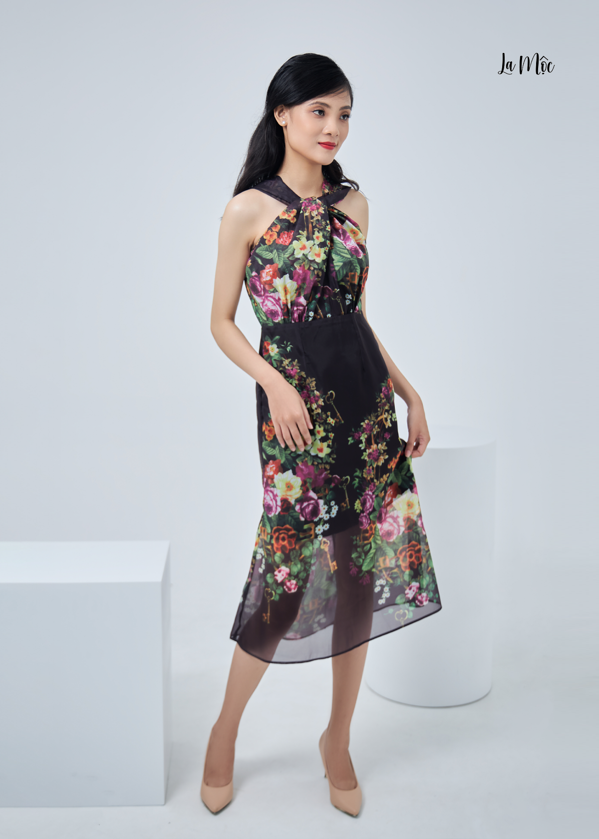 Đầm voan cổ yếm La Mộc dáng ôm body, họa tiết hoa, xòe nhẹ phần chân váy, ôm phần eo khoét lưng.