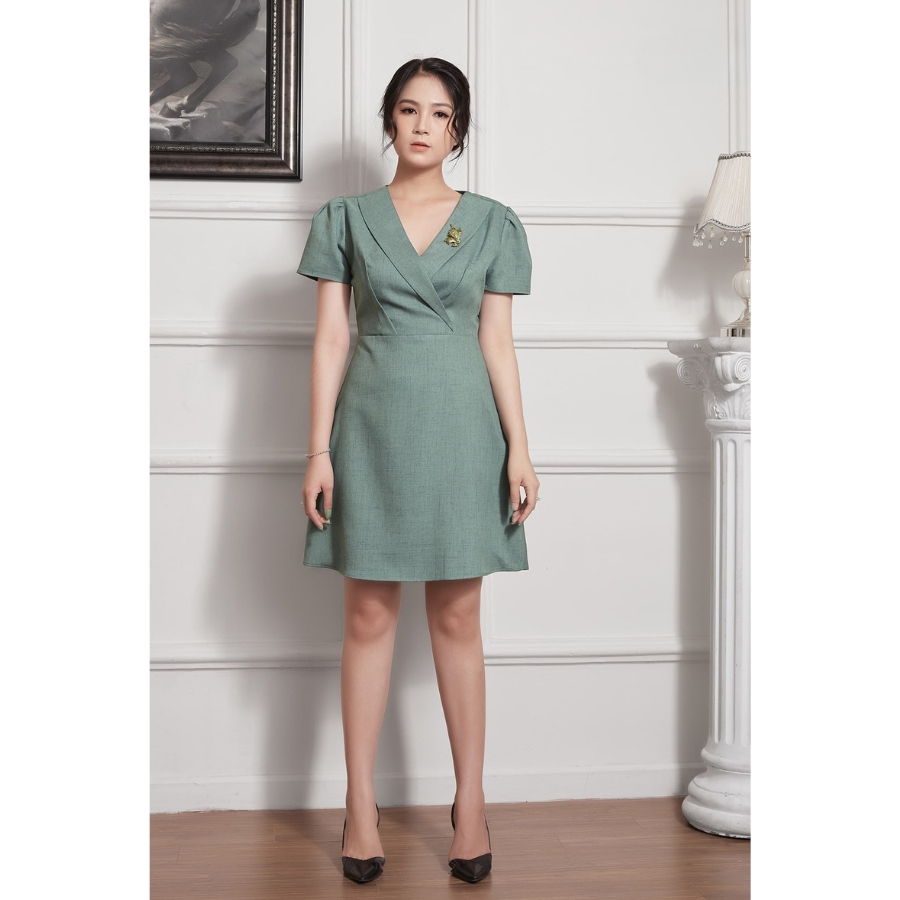 Đầm nữ dáng xòe, cổ tim màu xanh lá nhạt, chất lụa hàn quốc