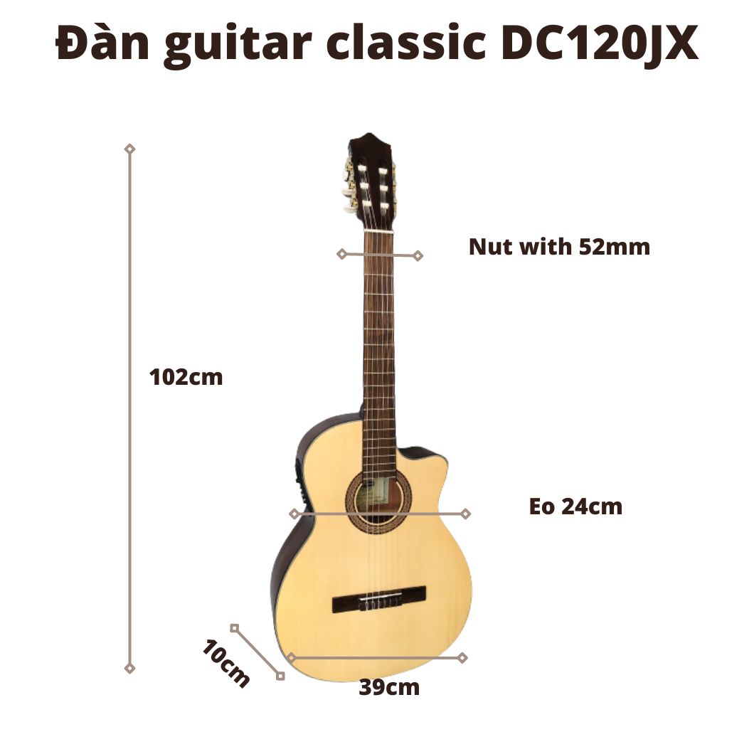 Đàn guitar classic DC120JX có EQ thùng full size có khuyết gỗ Hồng đào nguyên tấm Duy Guitar Store THÔNG TIN CHI TIẾT: Đàn guitar classic DC120JX là dòng có eq, model eq là 7545R