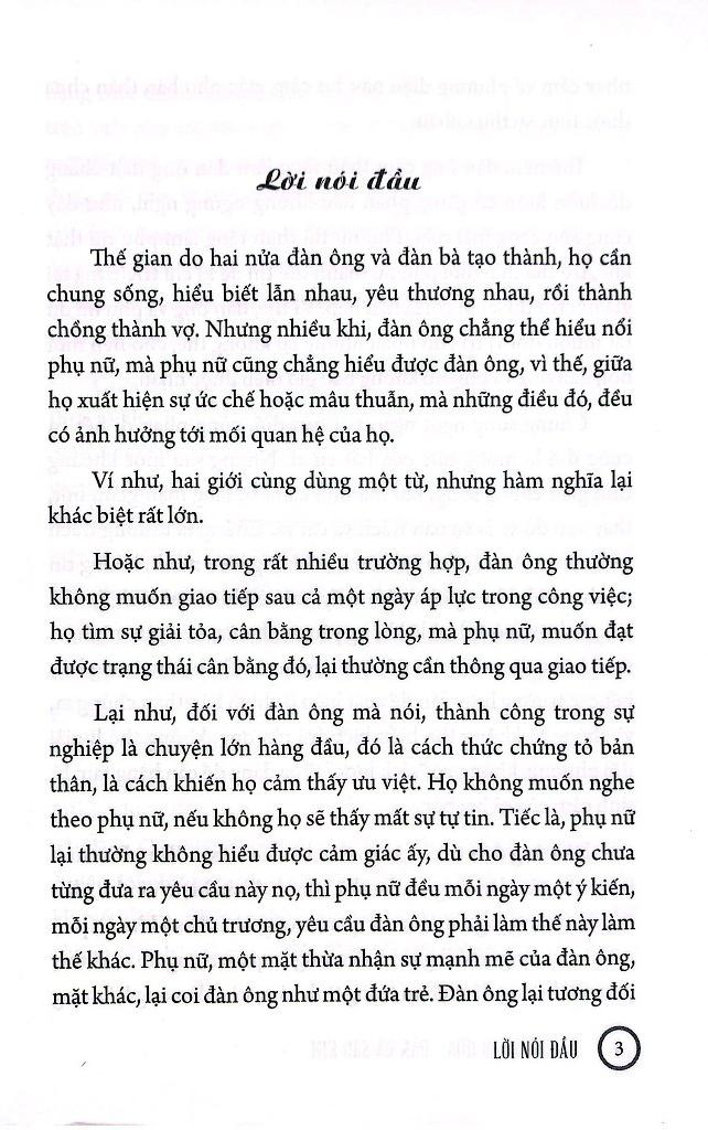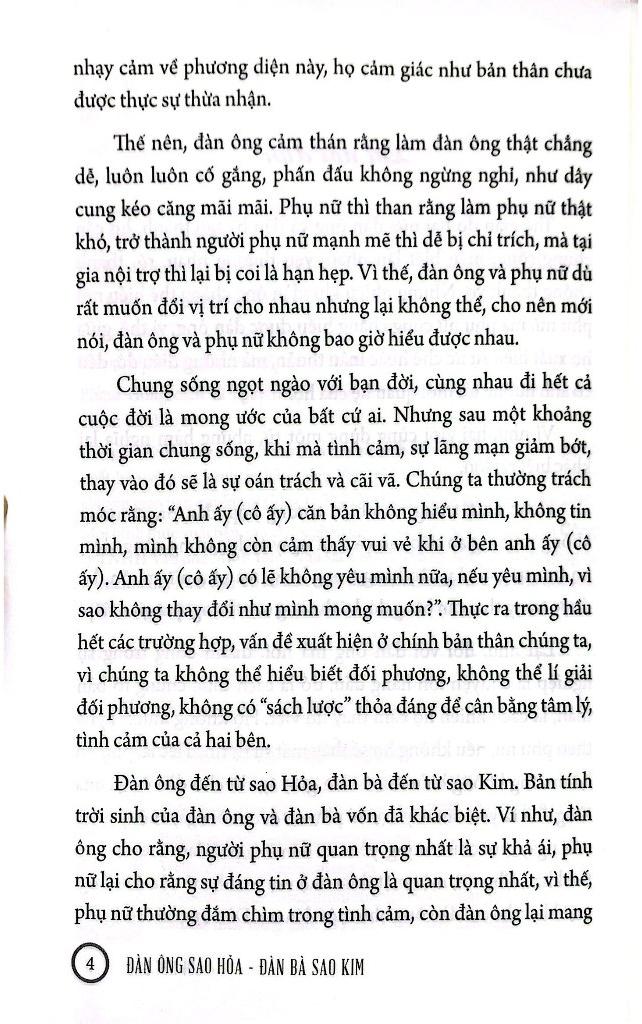 Hầu hết vấn đề xảy ra trong mối quan hệ giữa đàn ông và phụ nữ là kết quả của sự khác biệt tâm lý cơ bản giữa hai giới . Đối mặt với nó ra sao và giải quyết như thế nào luôn là mối quan tâm trăn trở của tất cả mọi người . Dù bạn đang yêu hay đã kết hôn , cuốn sách này sẽ đóng vai trò to lớn phân tích và đưa ra kỹ năng tôn trọng nhu cầu hay cảm nhận của đối phương , từ đó cải thiện mối quan hệ muôn thuở giữa "người sao Hoả " và " người sao Kim " .