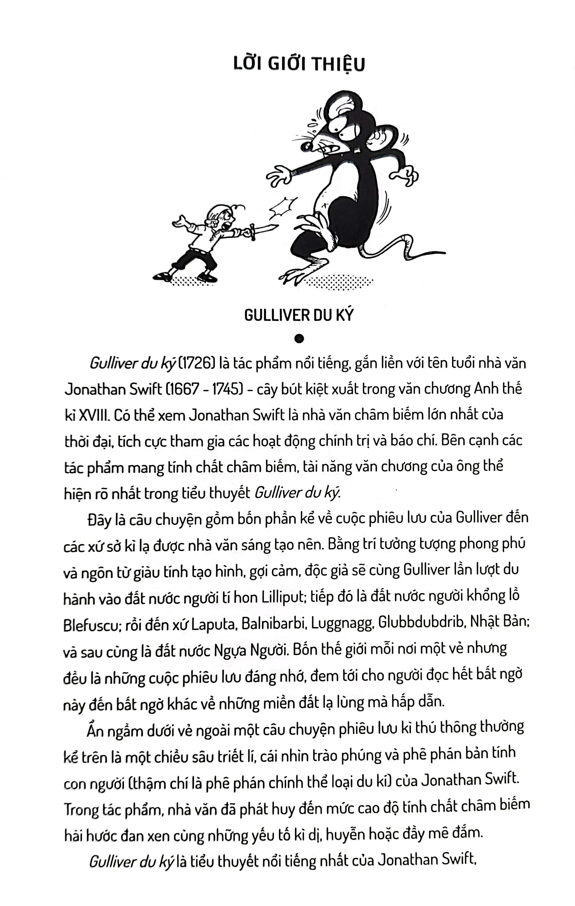 Jonathan Swift (1667-1745) là nhà văn, và cũng là một cha xứ người Ireland. Ông là tấm gương sáng về con người biết vượt lên số phận. Mặc dù cuộc sống gia đình không yên ổn, bản thân bệnh tật từ bé nhưng Jonathan luôn không ngừng nỗ lực phấn đấu. Ông rất được mọi người kính trọng, thậm chí còn được nhà nước Ailen phong tặng danh hiệu anh hùng. Cùng với CÂU CHUYỆN CỦA ĐOÀN THUYẾT GIÁO, CUỘC CHIẾN TRANH GIỮA CÁC QUYỂN SÁCH, ROBISON CRUSOE, GULLIVER DU KÝ đã góp phần không nhỏ làm cho tài năng, tên tuổi của tác gia văn học trào phúng toả sáng.
