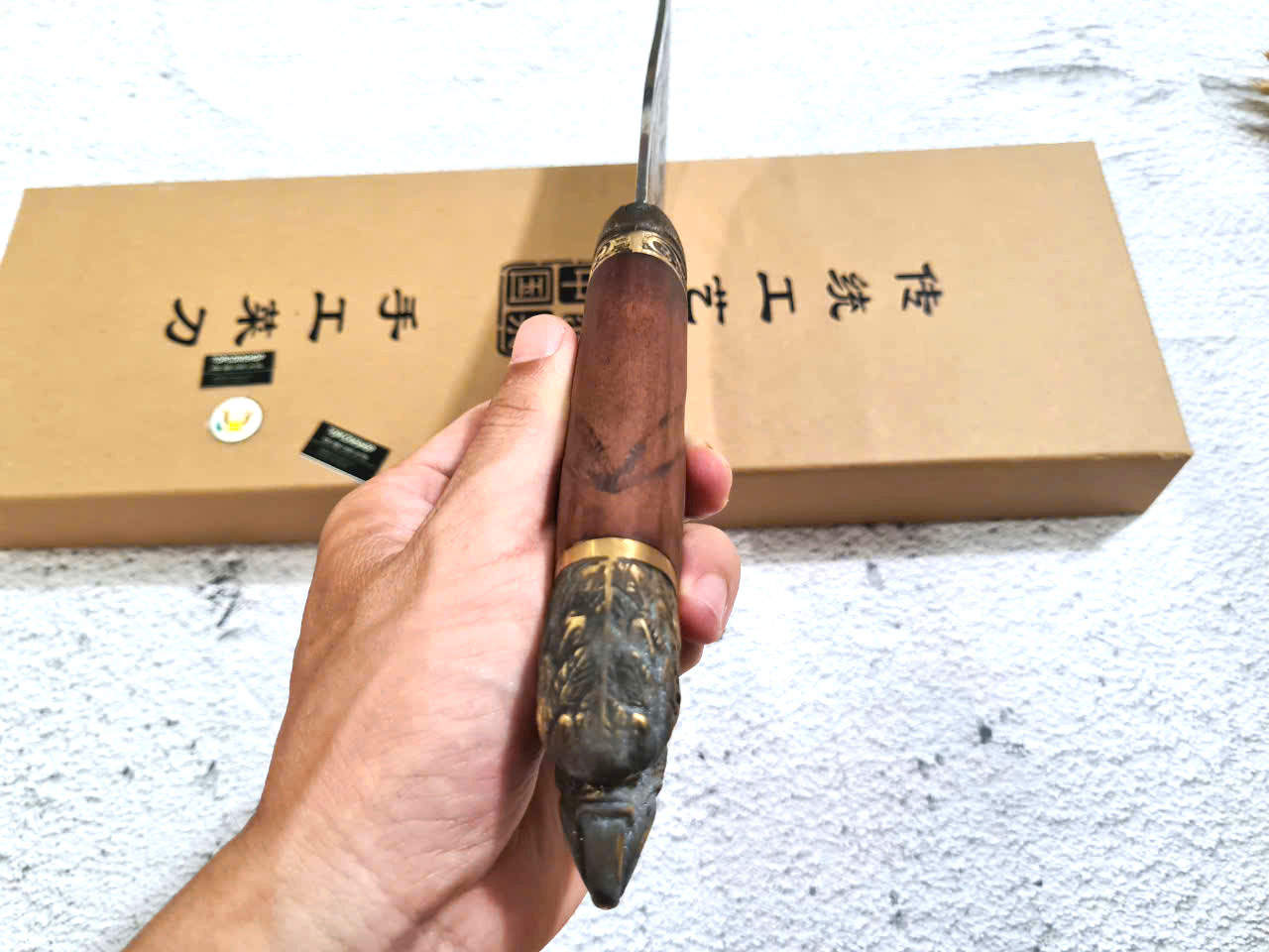 Chất liệu tay cầm: gỗ CẨM LAI, khâu và chuôi cuối dao bằng đồng thau