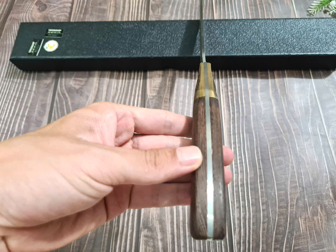 **** SASHIMI MÃ TR13 ều dài TỔNG: 37cm Chiều dài lưỡi: 23cm Chiều rộng lưỡi: 4.5cm, Độ dày lưỡi: 3mm Trọng lượng: 2.5 lạng chất liệu lưỡi : 7Cr17MOV (thép 7 crom 17 molypden vanadi) Chất liệu tay cầm: gỗ cẩm lai, phụ kiện khâu đầu hổ và chuôi bằng đồng