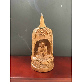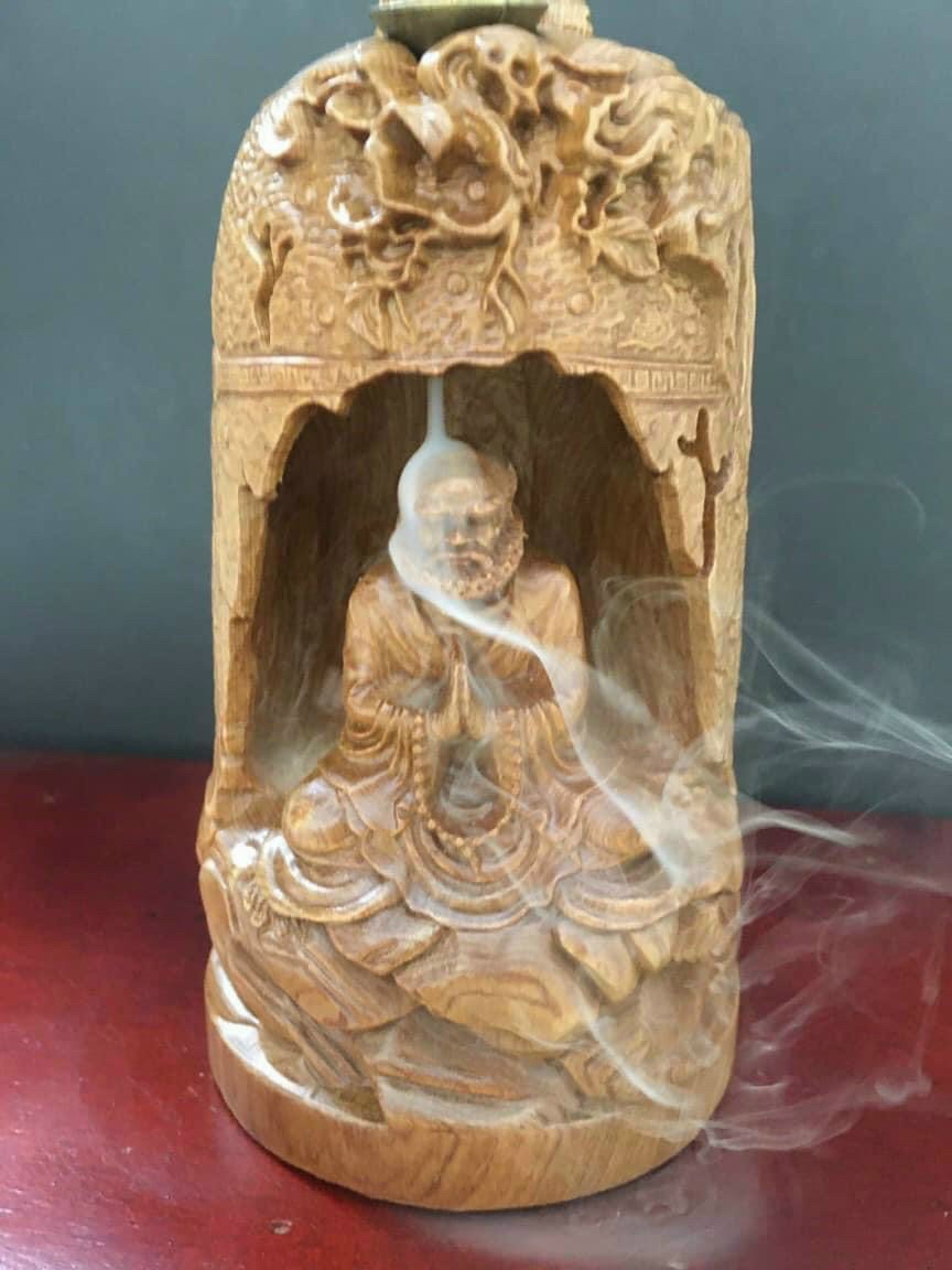 ✨Đạt ma sư tổ ngồi thiền đốt hương trầm bằng gỗ bách xanh thơm nức kt cao 20×9cm