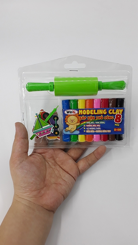 - Mềm dẻo - không dính tay Gồm 8 màu: Đỏ, nâu, đen, cam, hồng, vàng, xanh lá, xanh dương Có cây cán, que tăm nhỏ, hình mẫu