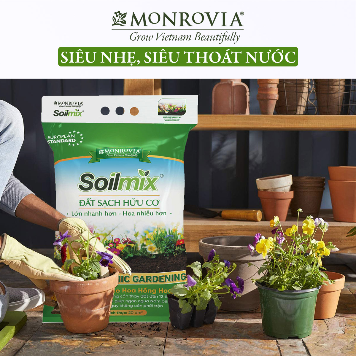 Với công thức độc quyền từ Monrovia, đất trồng cây Soilmix sử dụng hoàn toàn nguyên liệu hữu cơ sạch, loại nhập khẩu cho chất lượng vượt trội. Phân bón vi sinh giàu đạm, lân, kali, amino acid giúp cân bằng dinh dưỡng trong quá trình sinh trưởng và phát triển của cây.