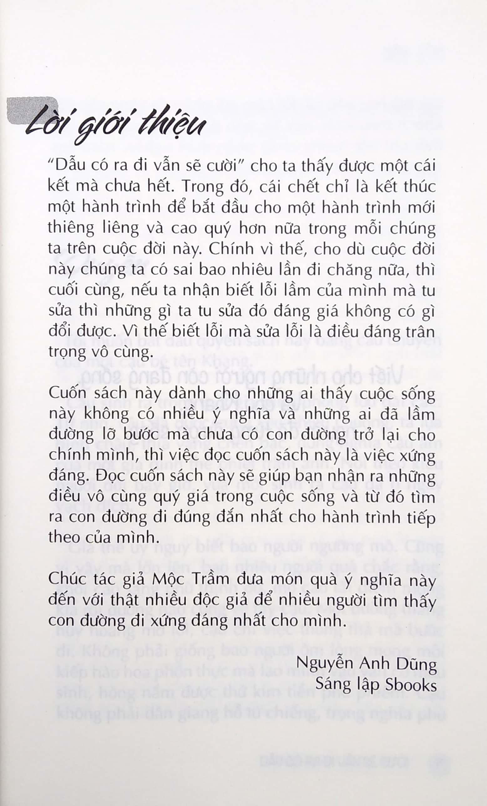 "Chỉ muốn rằng, quyển sách này sẽ chạm đến trái tim của những con người đã từng lạc bước ngoài kia và cả những người trẻ đang chập chững bước vào đời. Mong sao, khi gấp quyển sách lại, người ta sẽ yêu nhiều hơn cái cuộc đời bình sinh ngắn ngủi này. Họ sẽ thương nau hơn, chấp nhận và bao dung hơn những điều còn khiếm khuyết trong cuộc sống. Để cho dù có bất chợt ra đi, họ vẫn sẽ mỉm cười vì không còn gì băn khoăn và nuối tiếc.