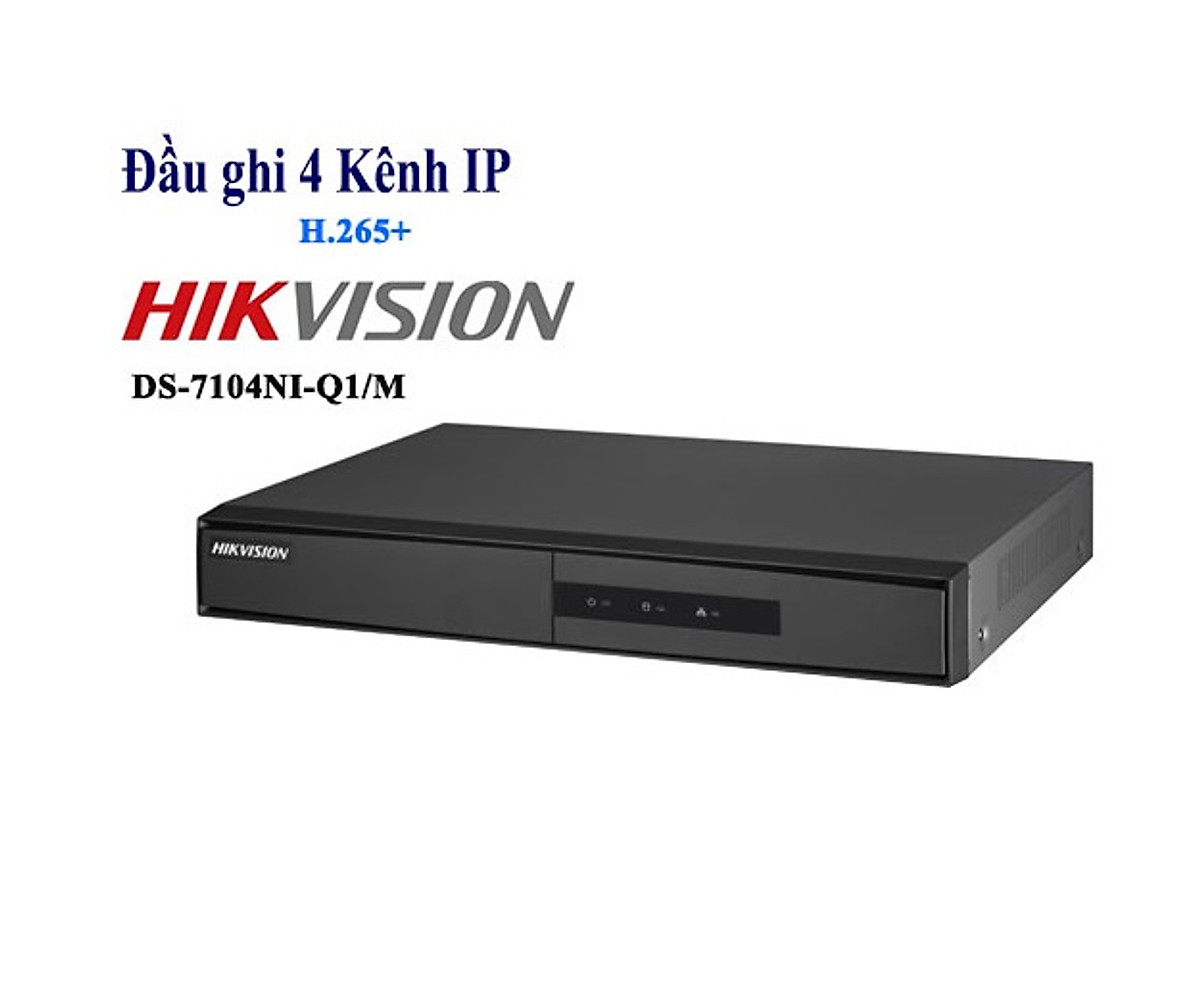 Thông số kỹ thuật đầu ghi IP H.265+ Hikvision DS-7104NI-Q1/M- 4 kênh- Chuẩn nén video H.265+/ H.265/ H.264+/ H.264- Cổng ra HDMI và VGA với độ phân giải 1920X1080P.- Độ phân giải ghi hình tối đa 4MP- Hỗ trợ ổ cứng dung lượng đến 6TB- Băng thông đầu vào 40Mbps, băng thông đầu ra 60Mbps- Hỗ trợ 1 cổng mạng 10/100/1000Mbps- Một cổng mạng RJ45 tối đa 1000Mbps, 2 USB 2.0- Kèm chuột. Miễn phí 1 host chính hãng trọn đời sản phẩm. - Vỏ kim loại- Nguồn cấp 12V DC- Xuất xứ: Trung Quốc