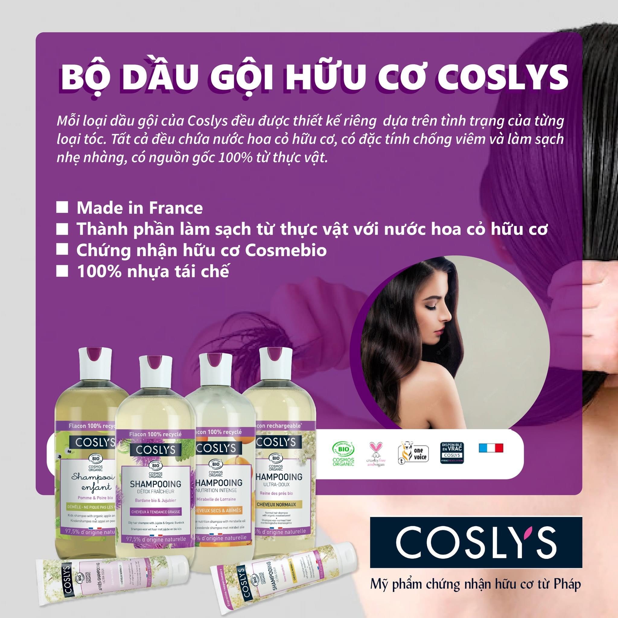 Chứng nhận hữu cơ Ecocert, Bio ️Thương hiệu: Coslys - Pháp ️Quy cách: chai 500ml HSD: 02/2027 (date) Dầu gội hữu cơ Coslys được làm giàu với tình dầu mận mirabelle và bơ hạt mỡ