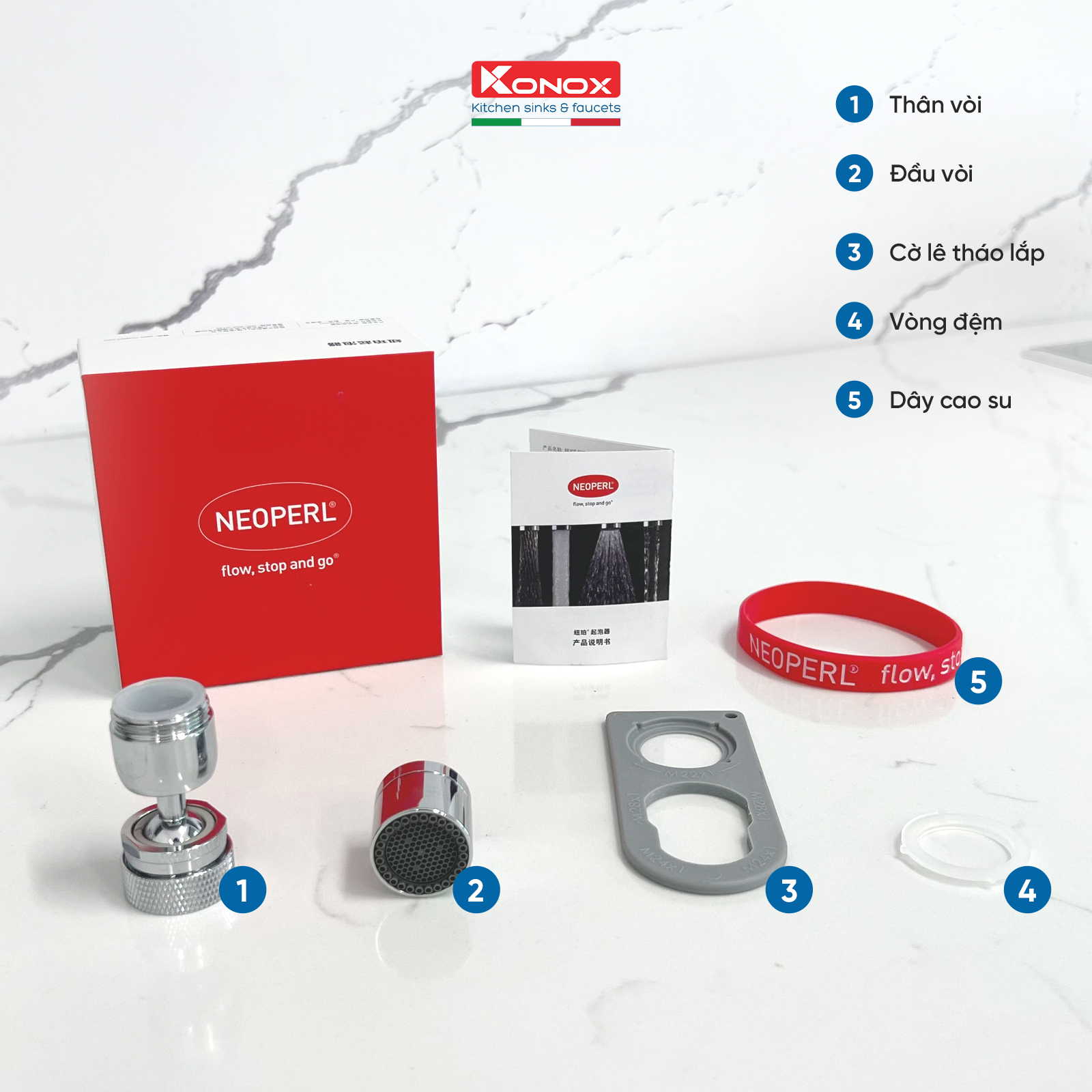 Đầu nối vòi nước thông minh Neoperl Swivel Aerator - SA01 là sản phẩm phụ kiện dành cho vòi rửa bát nóng lạnh thông thường - Sản phẩm có hai ren: Ren trong: 22mm, Ren ngoài: 24mm. SA01 hỗ trợ việc xối rửa hiệu quả hơn bằng cách cho phép xoay 360° tiếp cận mọi góc của bồn rửa.