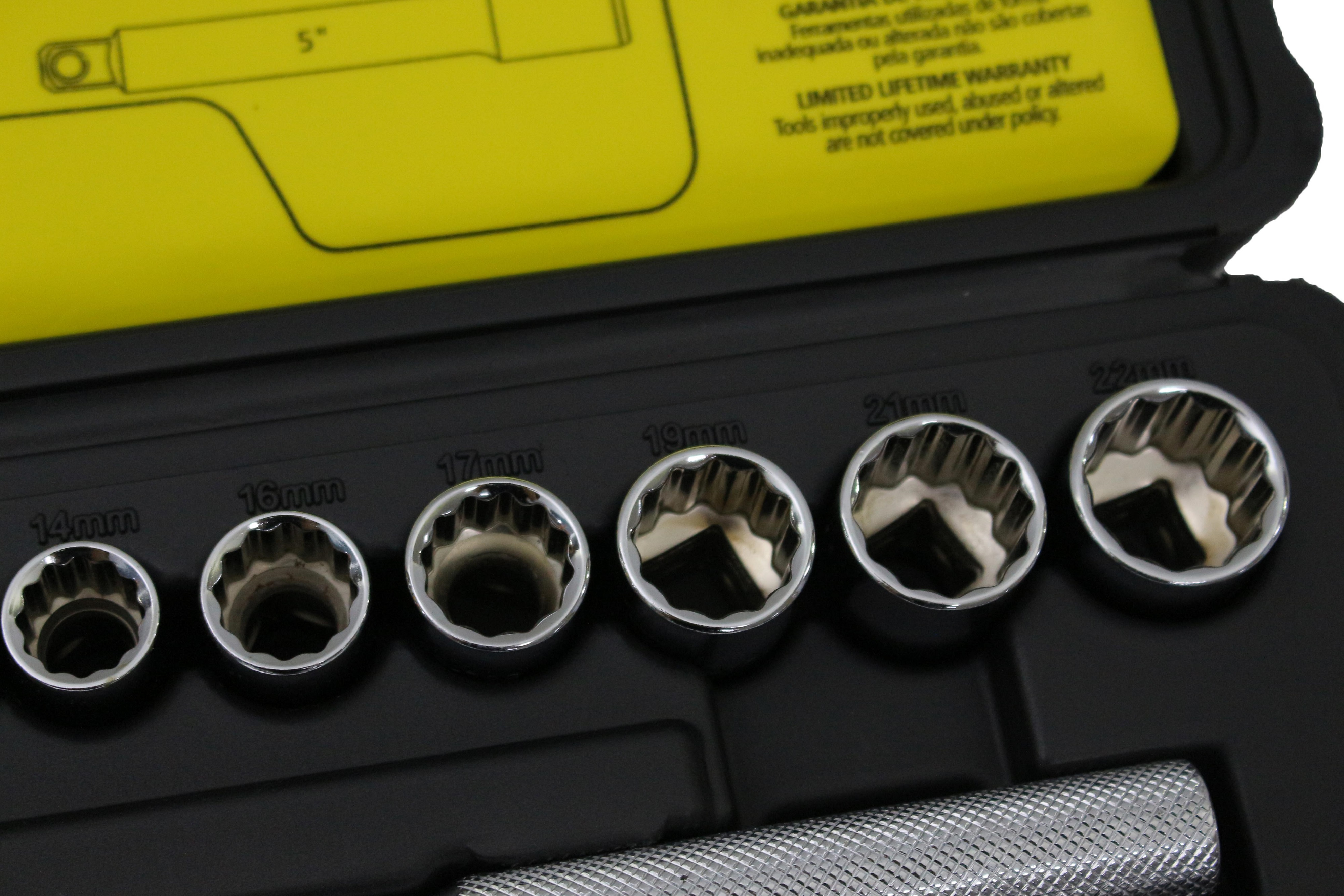 - Bộ sản phẩm có 14 chi tiết gồm: 10 đầu tuýp 6 góc, kích thước lần lượt là: 10, 11, 12, 13, 14, 16, 17, 19, 21, 22 mm