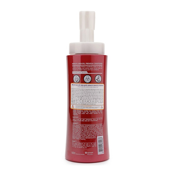 Dầu xả cao cấp Hàn Quốc KeraSys Oriental Premium với tinh dầu hạt trà giúp tạo thành lớp màng vững chắc bảo vệ da đầu khỏi những tác động xấu và bổ sung cho da đầu thành phần lipid còn thiếu, giúp mái tóc dày, khỏe mạnh, suôn mềm, óng mượt.Chất xơ có trong thành phần Keratin sẽ giúp cho mái tóc bị hư tổn trở nên khỏe và mềm mượt hơn. Kết quả thực tế được kiểm nghiệm tại các viện nghiên cứu hàng đầu thế giới, tóc mềm hơn 1.6 lần và cải thiện 79% tình trạng xơ gẫy chỉ sau 5 lần sử dụng.Kerasys được sản xuất dưới quy trình khắt khe tăng 2.5 lần dưỡng tóc, giúp tóc chắc khỏe, suôn mượt. Sau khi sử dụng, tóc sẽ được bảo vệ bởi 1 lớp màng mỏng tránh hư tổn từ các tác động bên ngoài đồng thời rất êm dịu, không gây kích ứng cho da đầu. Hướng dẫn sử dụngLấy một lượng dầu vừa đủ ra lòng bàn tay thoa đều lên tóc từ thân tới ngọn, massage nhẹ nhàng trong vài phút giúp cho dầu xả thấm sâu vào tóc, sau đó xả sạch bằng nước