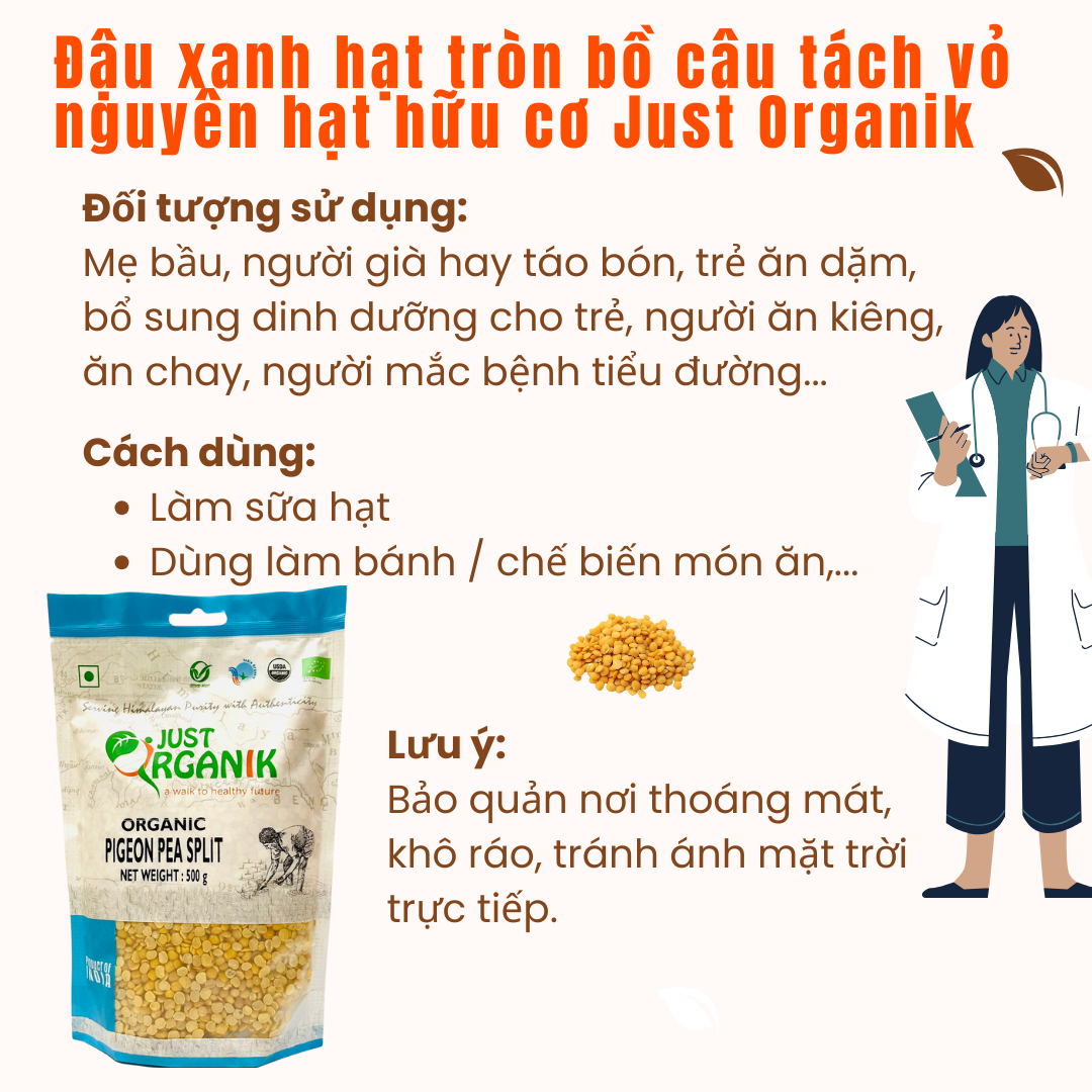 Đậu Xanh Đậu Bồ Câu Hạt Tròn Hữu Cơ Just Organik Nhập Khẩu Ấn Độ Cho Người Giảm Cân Ăn Kiêng, Cho Bé Ăn Dặm * Thông tin sản phẩm: - Thành phần: đậu