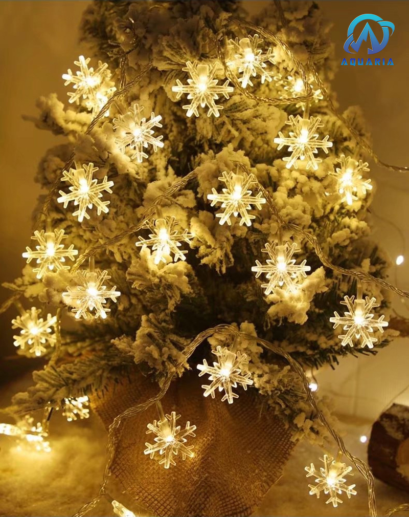 • Có 20/100 đèn LED với kiểu dáng hình hoa tuyết đẹp mắt, trắng tinh bằng nhựa, được mắc nối tiếp trên dây với khoảng cách bằng nhau.