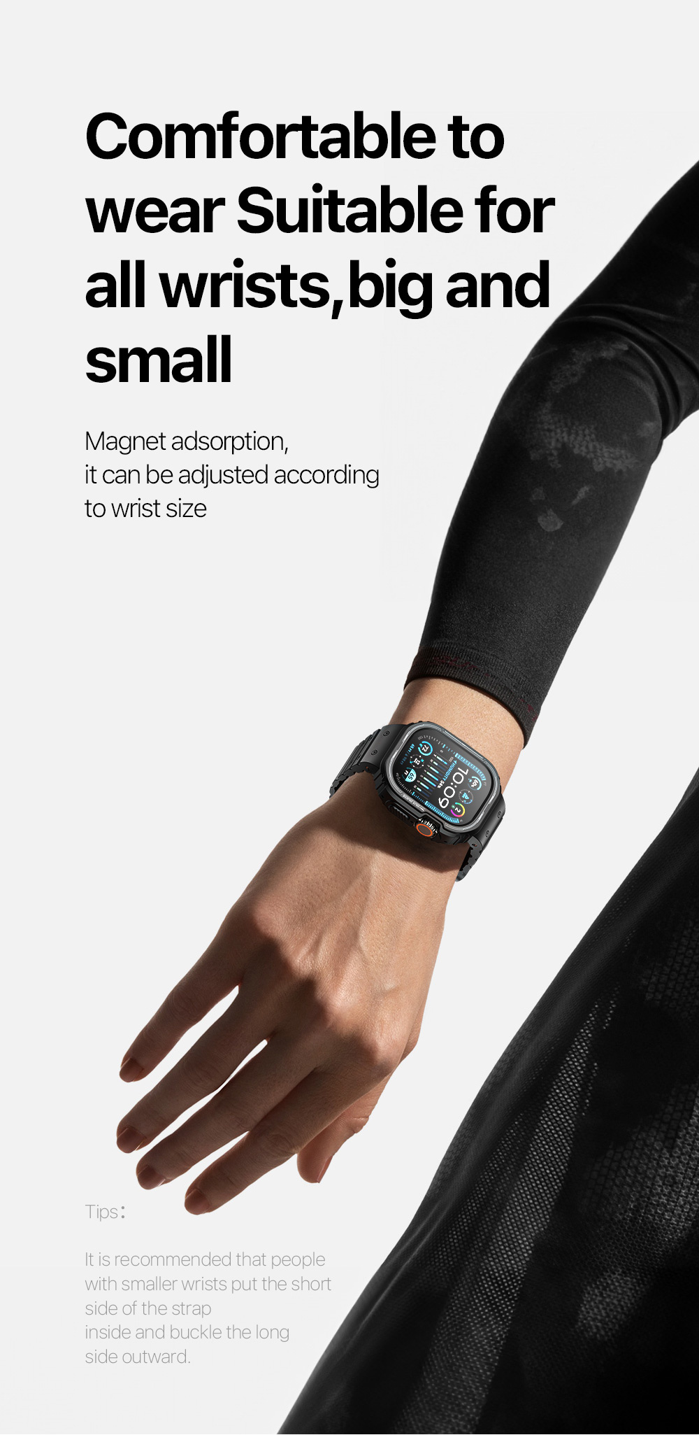 Dây đeo đồng hồ từ tính một mảnh được làm bằng nam châm TPU, silicone và N52. Dây đeo và vỏ được kết nối với nhau không chỉ mang lại sự bảo vệ toàn diện cho đồng hồ mà còn giúp việc lắp đặt và tháo gỡ trở nên dễ dàng. Chất liệu silicon co giãn và thân thiện với da, dây đeo rất thoải mái khi đeo trong thời gian dài. Độ dài của nó có thể được điều chỉnh tự do và có thể được áp dụng cho nhiều cổ tay khác nhau, bất kể kích thước, đồng thời nam châm mạnh N52 đảm bảo rằng nó sẽ không rơi ra khỏi cổ tay của bạn. Những người có cổ tay nhỏ hơn nên đặt mặt ngắn của dây đeo vào bên trong và khóa mặt dài ra ngoài.