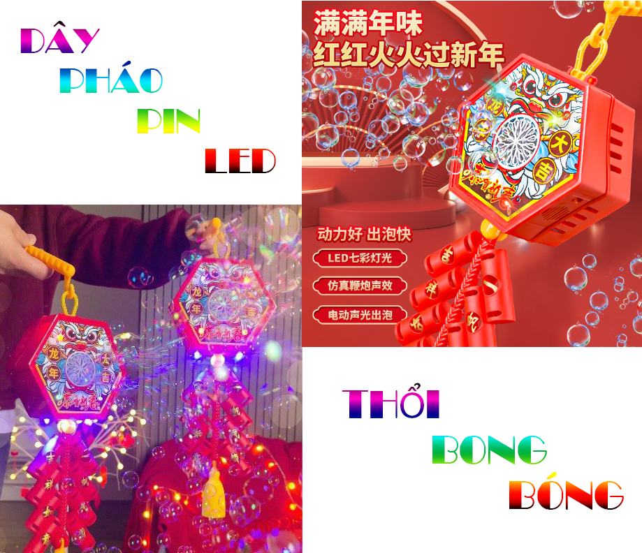 Đồ chơi ngày Tết - Dây Pha/o Thổi Bong Bóng Có Đèn Led Vui Nhộn Dùng Pin Trang trí theo chủ đề Tết với gam màu đỏ vàng sặc sỡ là biểu tượng cho sự