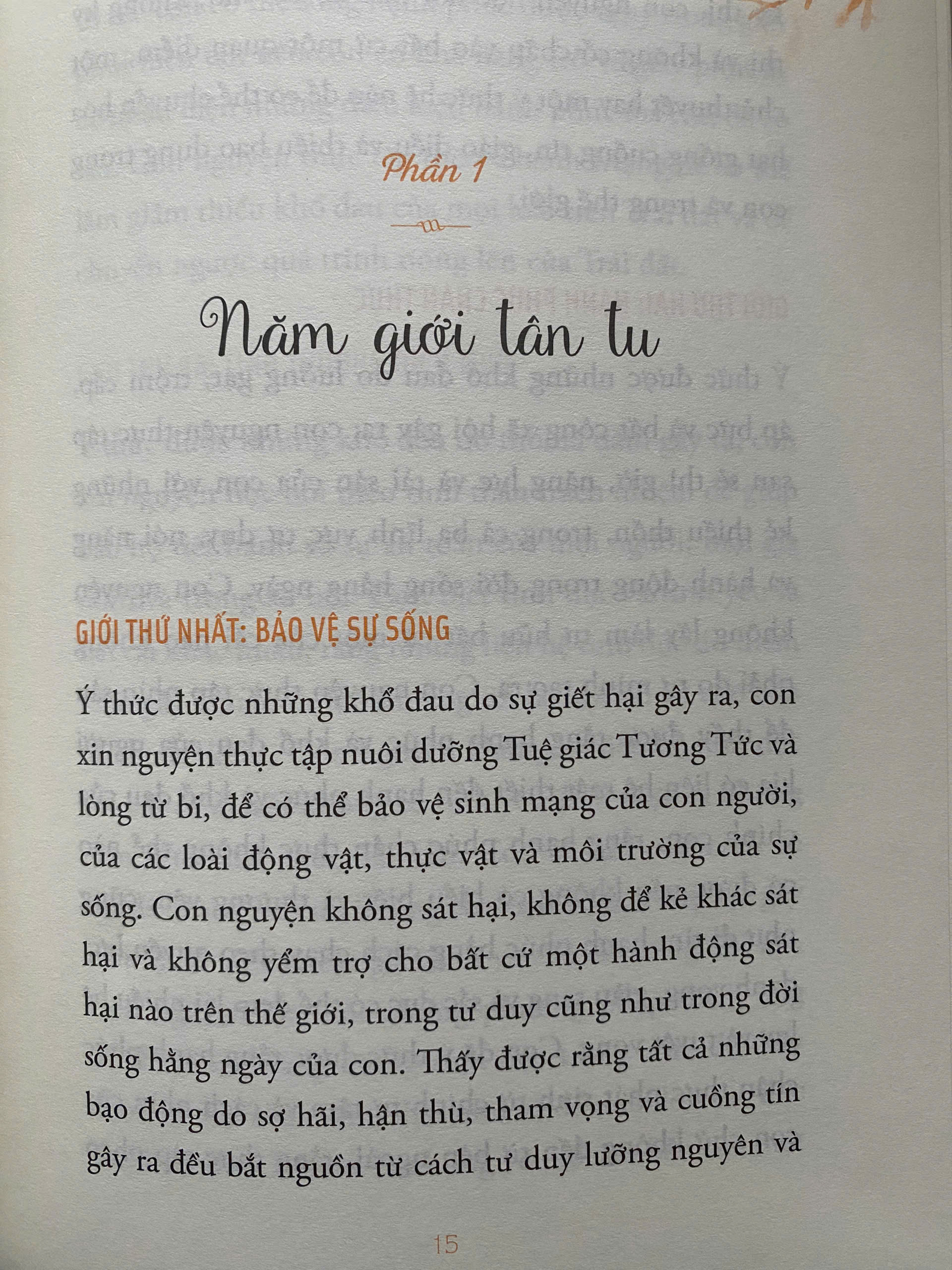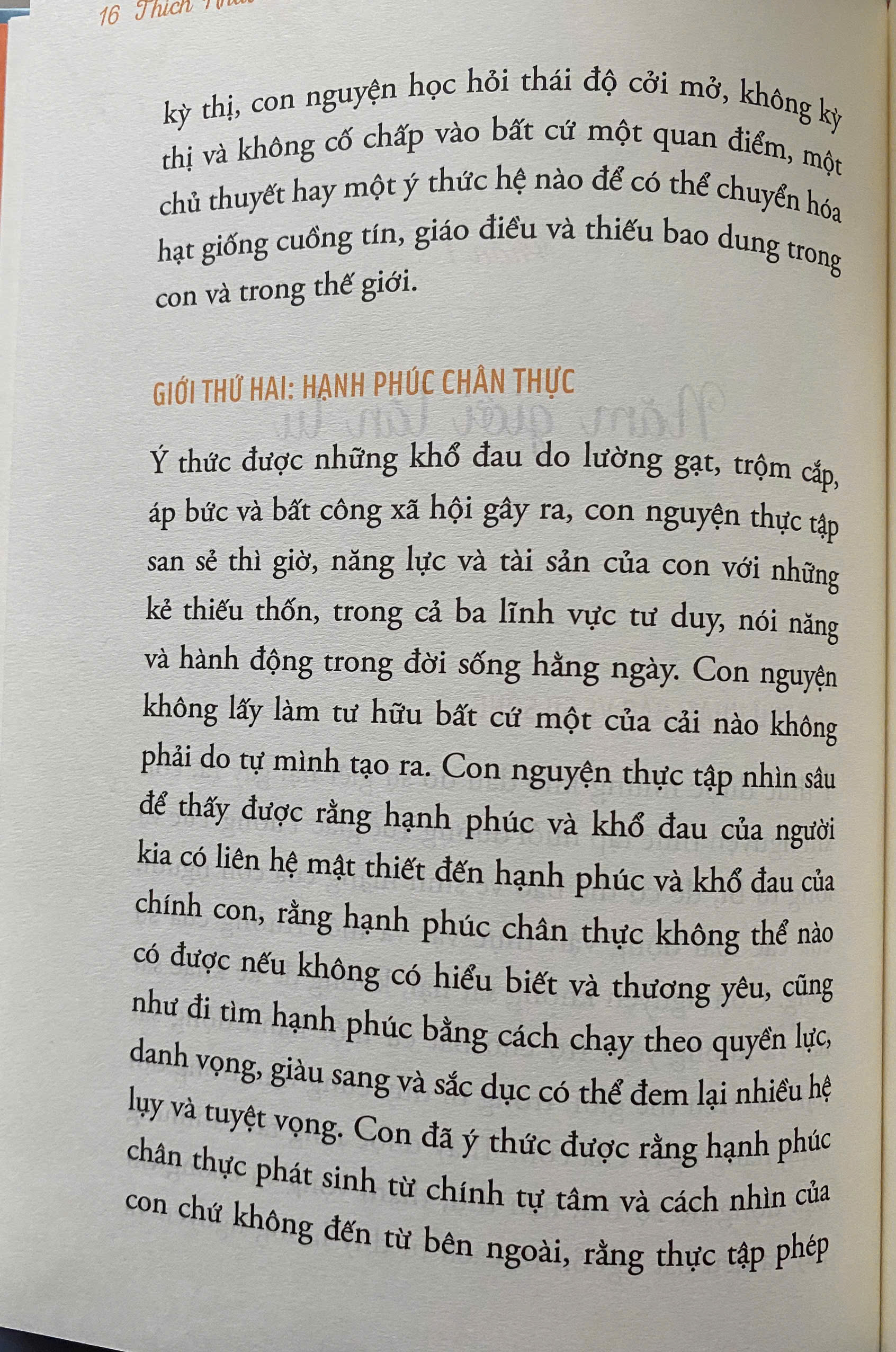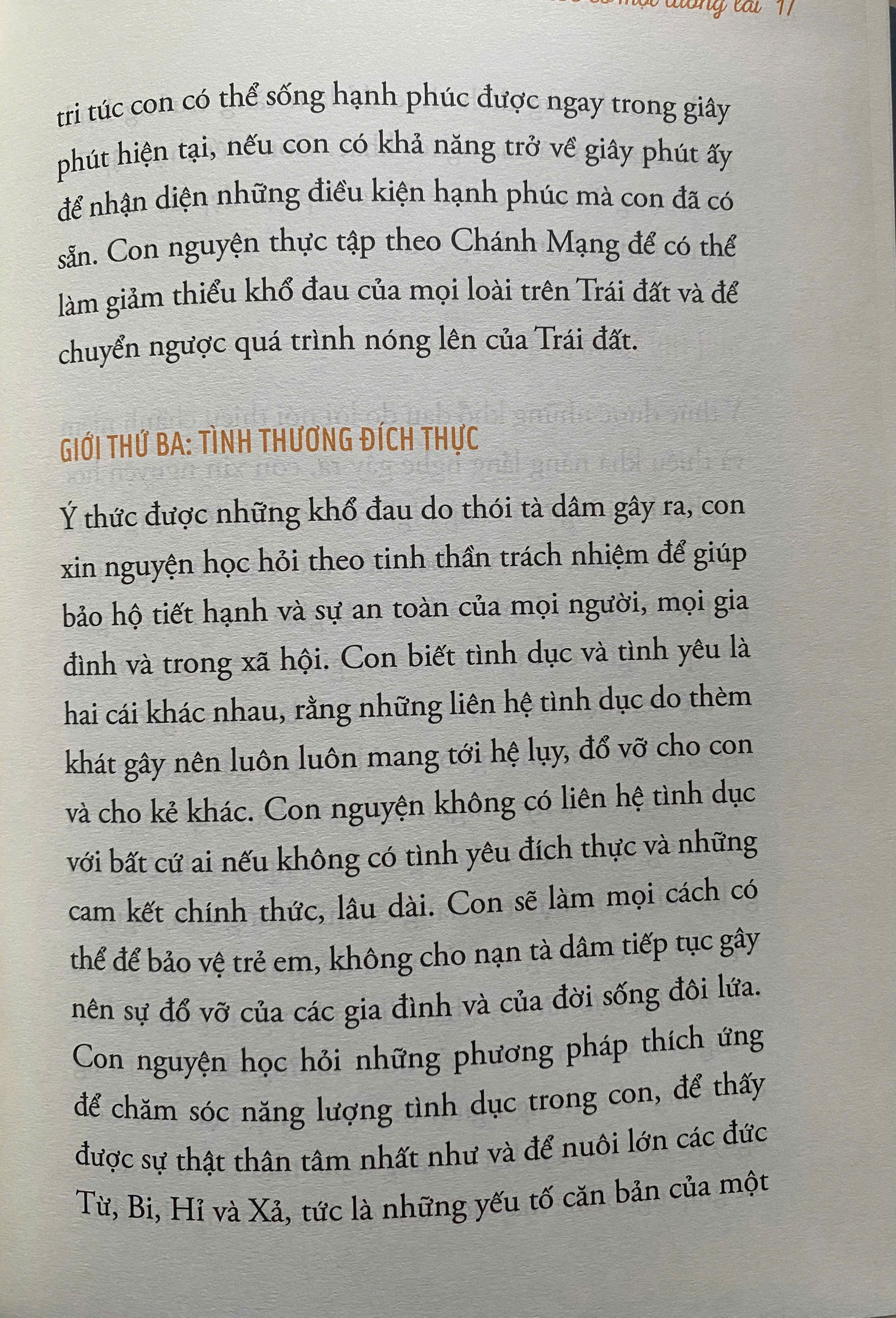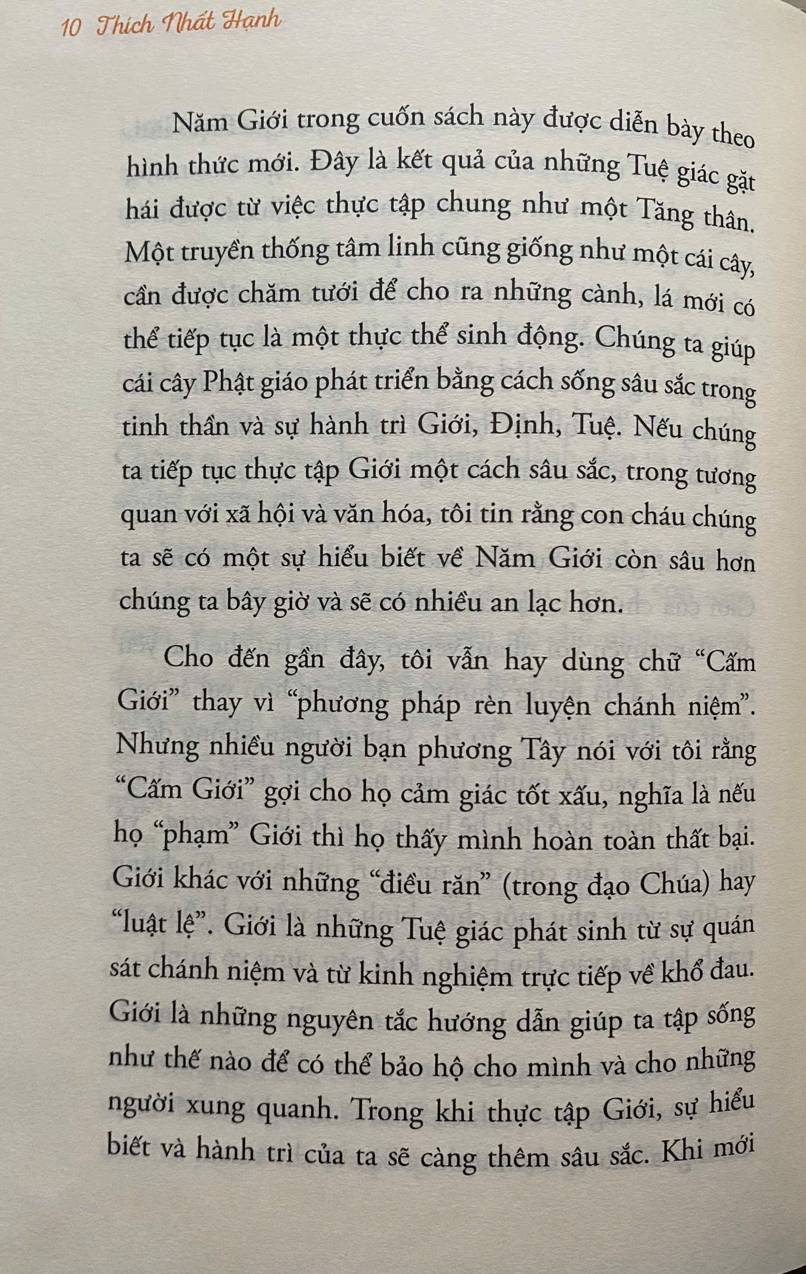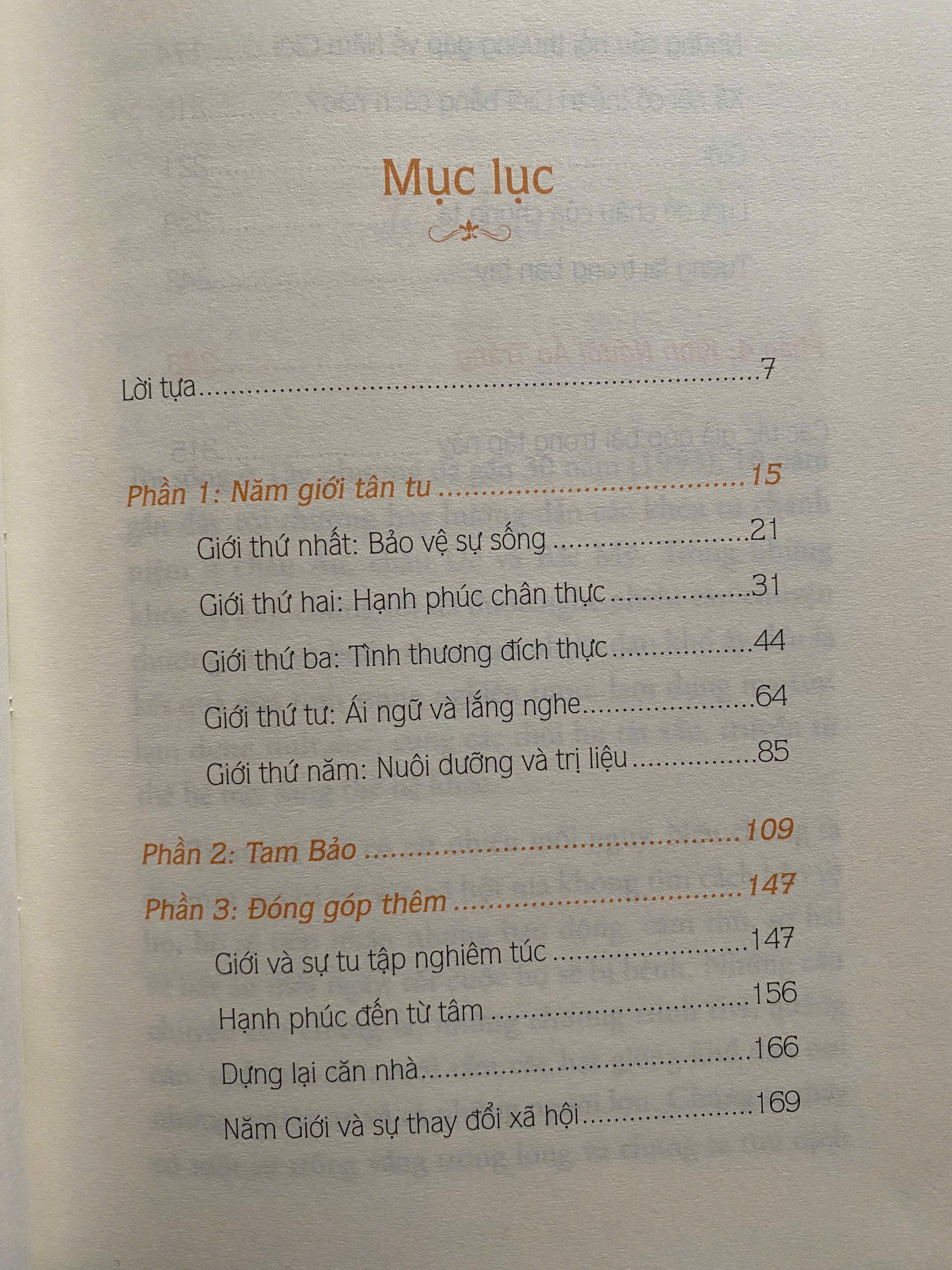 Học hỏi và thực tập theo Năm Giới và nương tựa Tam Bảo chắc chắn sẽ mang lại an lạc cho bản thân, cho cộng đồng và cho xã hội. Là con người, chúng ta cần có một cái gì để tin tưởng, một cái gì lành, đẹp và thật, một cái gì mà ta có thể tiếp xúc. Trong quyển sách này, Năm Giới được diễn bày theo hình thức mới, đó là Bảo vệ sự sống, Hạnh phúc chân thực, Tình thương đích thực, Ái ngữ và Lắng nghe, Nuôi dưỡng và trị liệu.