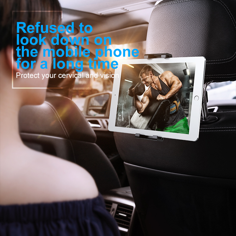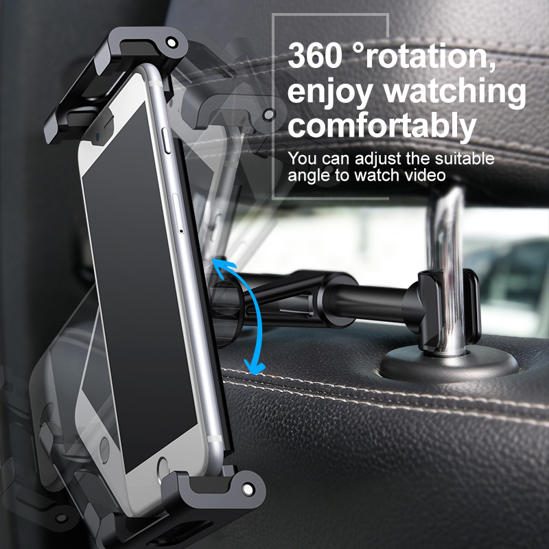 1. Materials: ABS + PC + Aluminum alloy 2. Suitable for phone and tablet with 4.7-12.9 inch screen 3. Support the diameter of headrest rod:≤14mm 4. 360 degree rotation 5. Anti-slip design 6. Color: Black