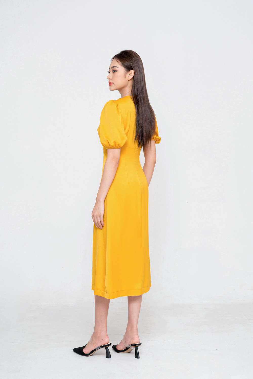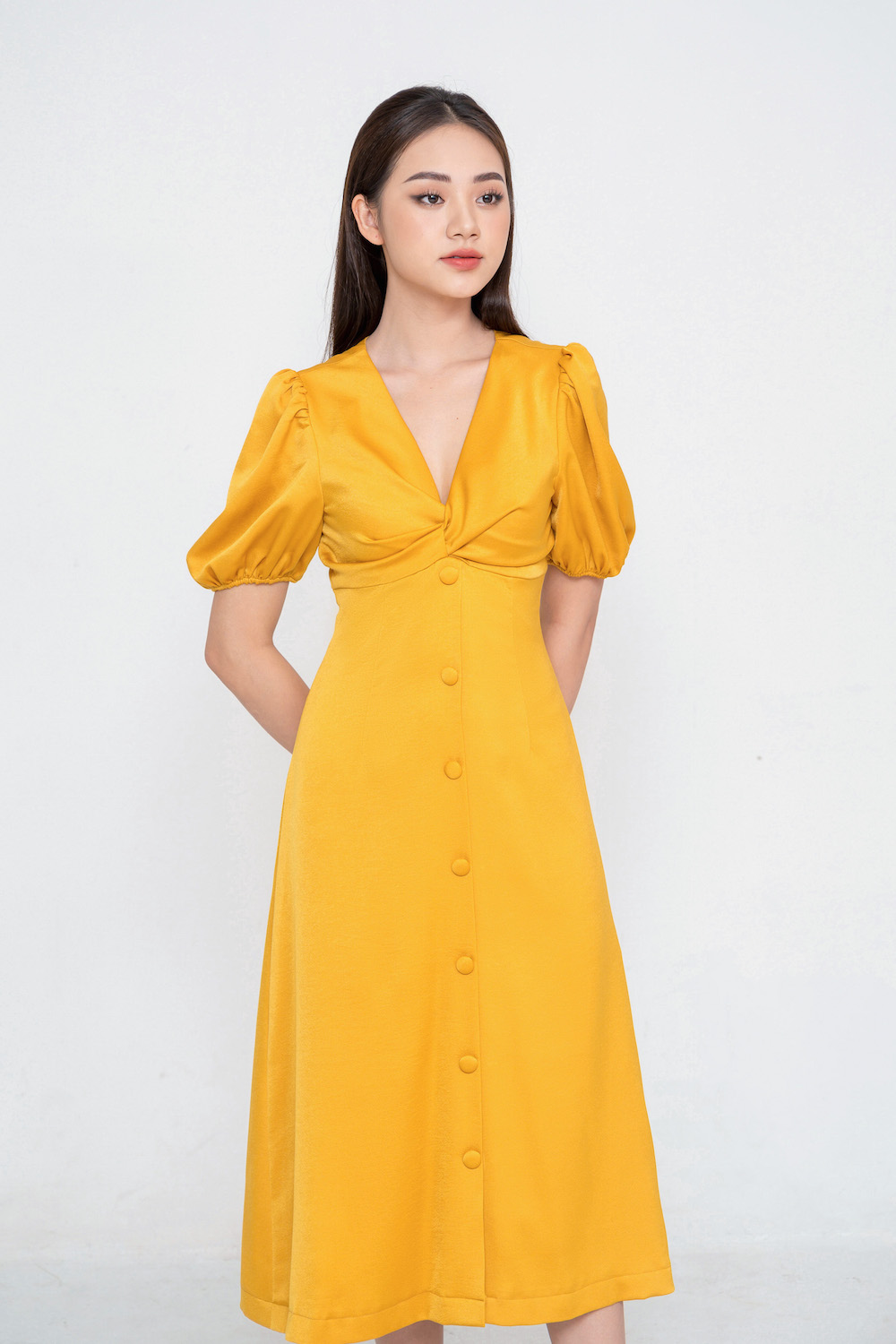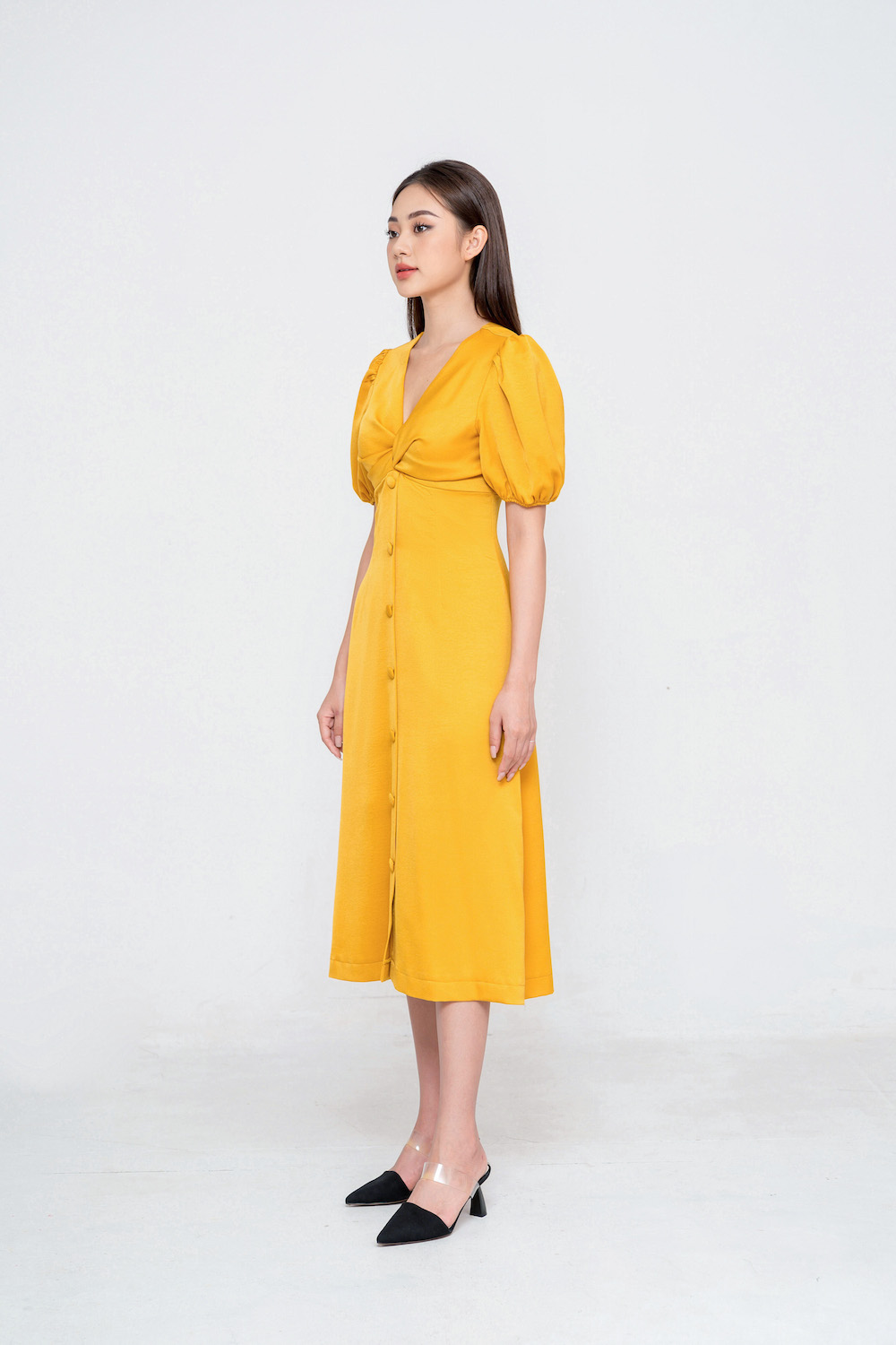 ✨De Leah - Đầm ôm midi xoắn nơ ngực Vàng