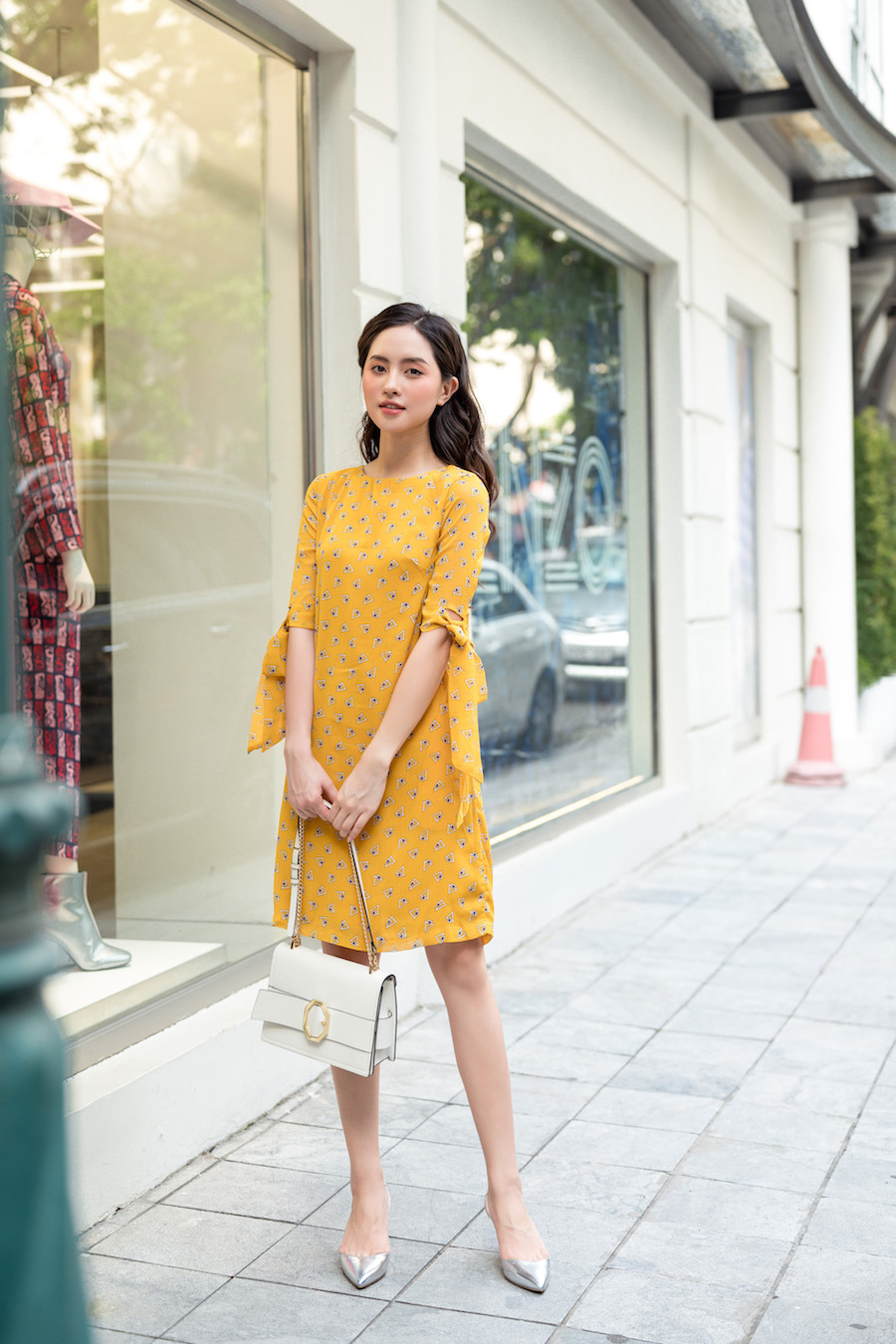 ✨De Leah - Đầm Suông Tay Lỡ Dây Nơ - Vàng hoạ tiết