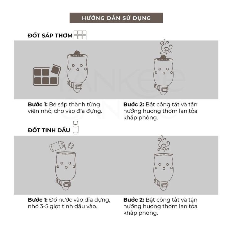 Đèn khuếch tán hương thơm sử dụng bóng đèn Edison để làm sáp ấm lên và tan chảy trong đĩa, từ đó lan tỏa hương thơm trong không khí. HƯỚNG DẪN SỬ DỤNG