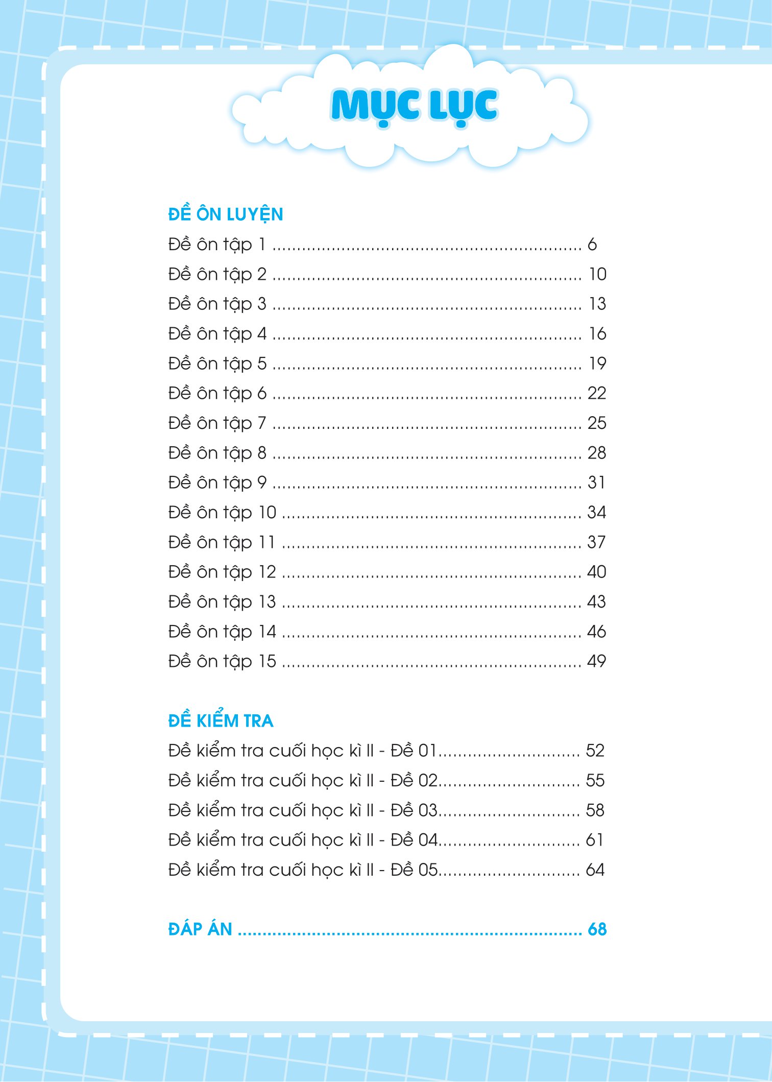 - Sách được chia thành 2 phần rất dễ hiểu cho các bé: Phần đề ôn tập và Phần đề kiểm tra. Phần đề ôn tập: Gồm 15 đề được chia theo các chủ điểm, hoặc chia thành các đề ôn tập theo sát chương trình học trên lớp theo giai đoạn. Phần đề kiểm tra: Gồm 5 đề kiểm tra cuối học kỳ để kiểm tra, đánh giá kiến thức tổng hợp của học sinh.