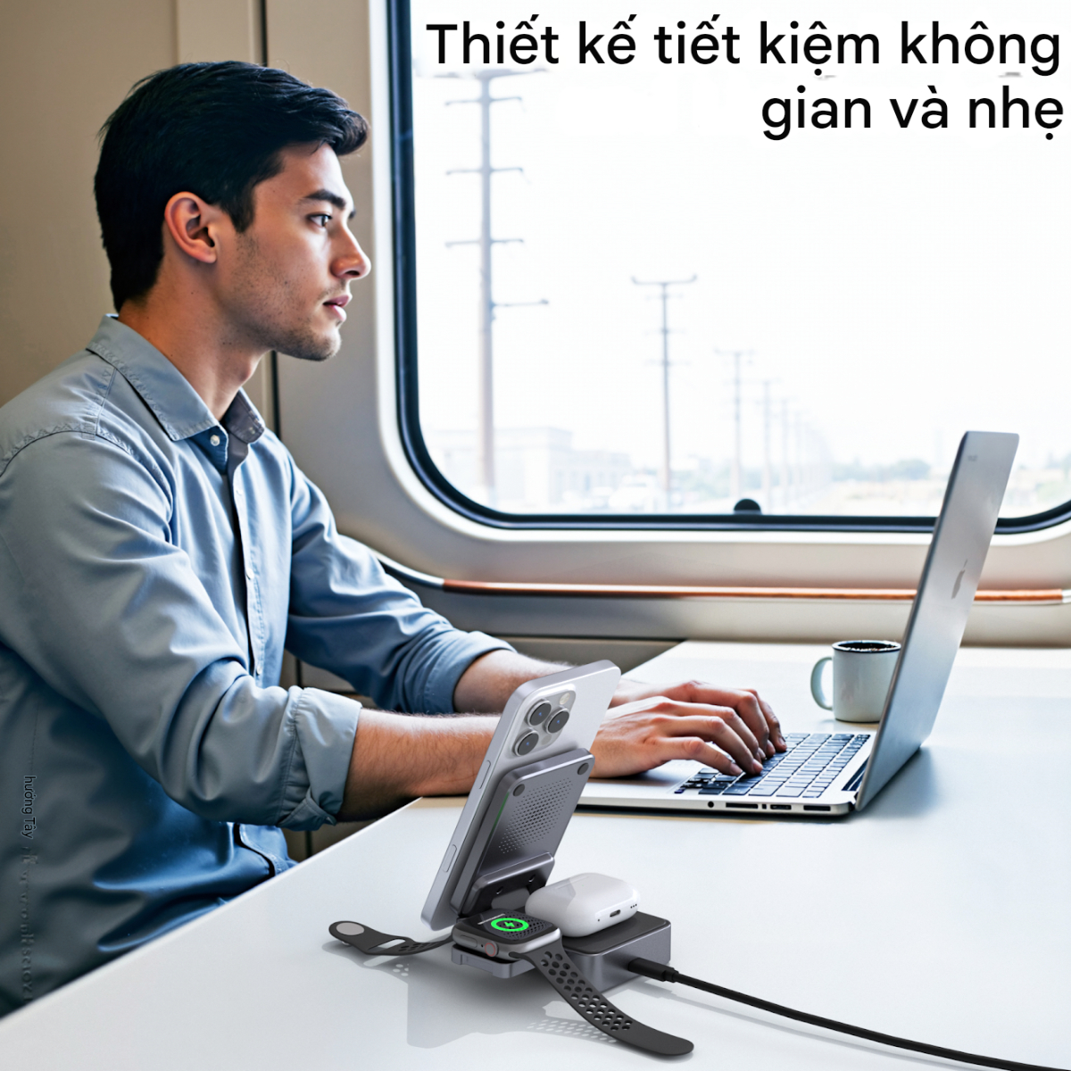 - I-watch : 2.5W Màu sắc: Đen xám hiện đại Chất liệu: ABS + PC, hợp kim nhôm – Mang đến sự tối giản và hiệu quả trong từng thao tác sạc, đế sạc nhanh không dây 3 in 1 gấp gọn Choetech T637 là phụ kiện lý tưởng. Với thiết kế thông minh, hiện đại cùng khả năng gập gọn linh hoạt và tích hợp chuẩn Qi2 mới nhất, công suất lên đến 15W. Thông tin chi tiết – Sạc 3 thiết bị 'nhà táo' cùng lúc: