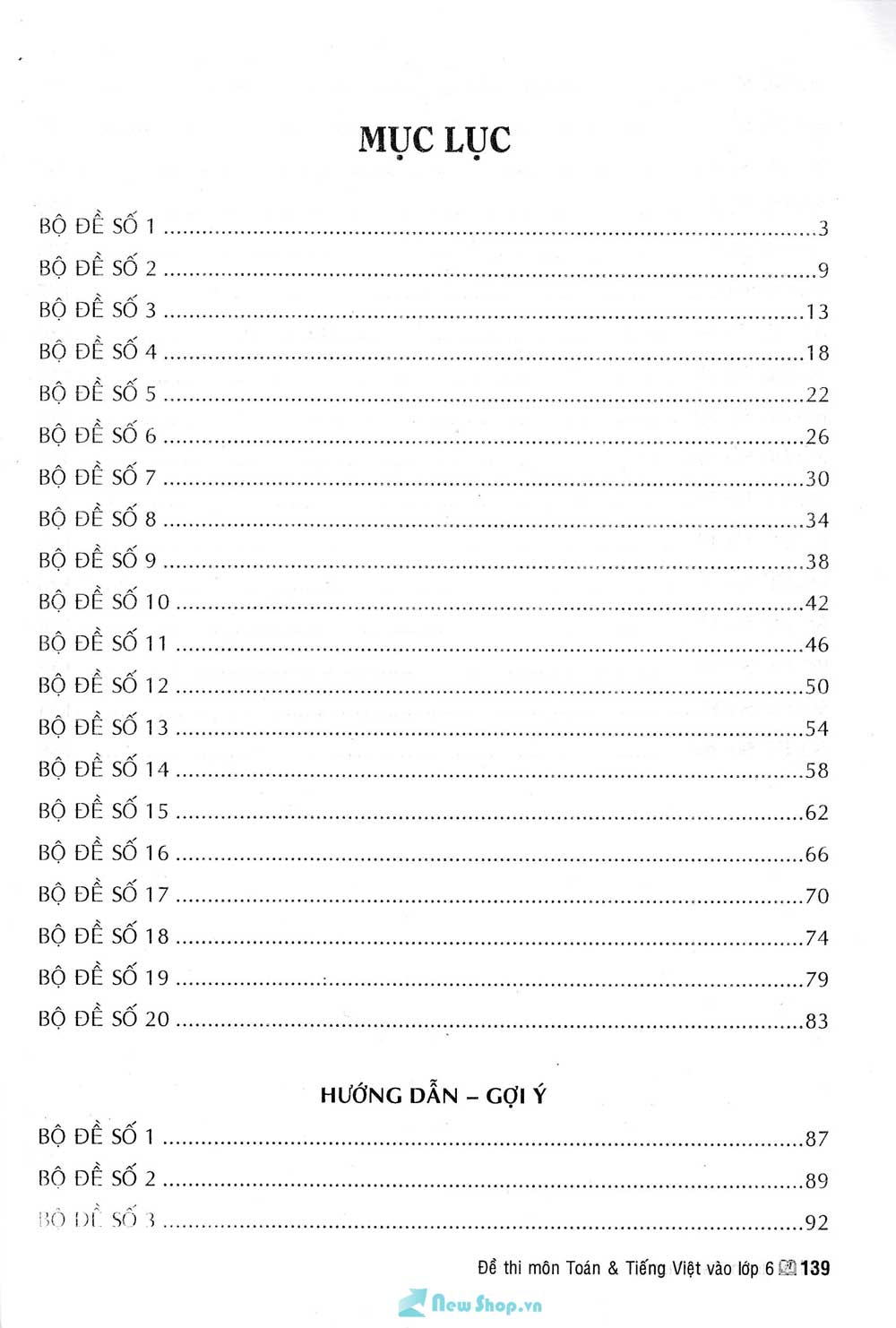Đề Thi Môn Toán Và Tiếng Việt Vào Lớp 6 Vào cuối năm học, đặc biệt là năm cuối cấp, chúng ta sẽ được kiểm tra, đánh giá kết quả học tập và rèn luyện bản thân. Cuốn sách Đề Thi Môn Toán Và Tiếng Việt Vào Lớp 6 gồm 20 đề, mỗi đề gồm: Môn Toán: Phần I: Trắc nghiệm khách quan Phần II: Tự luận Môn Tiếng Việt: Phần 1: Phần bài đọc. Phần 2: Phần bài viết. Các em có thể làm bài ngay trong tập sách này rất thuận tiện. Cuốn sách tin rằng với những đề kiểm tra được soạn trong tập sách sẽ giúp các em nắm vững kiến thức đã học, nhớ rõ nội dung trọng tâm của chương trình và thực hiện tốt bài thi tuyển vào lớp 6 của môn Toán và Tiếng Việt.