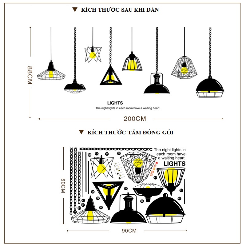 Mua tại TiktokDecal dán tường Đèn treo 7 với hình ảnh độc đáo, cá tính. Decal sẽ mang lại một không gian đầy phong cách cho căn phòng của bạn ! Kích thước sau khi dán: Cao 88 x ngang 200 cm Chất liệu : nhựa PVC vinyl cao cấp, thích hợp dán trên nhiều bề mặt, màu sắc tốt, ít phai màu Thời gian sử dụng từ 1 - 3 năm tuỳ theo điều kiện tường *** Hướng dẫn dán decal tại nhà :